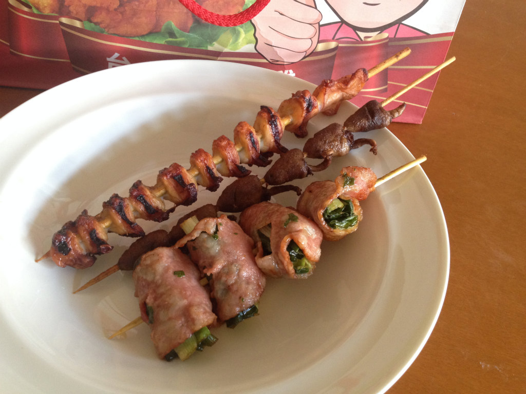 タコの足、鶏の心臓、韮のベーコン巻きです。