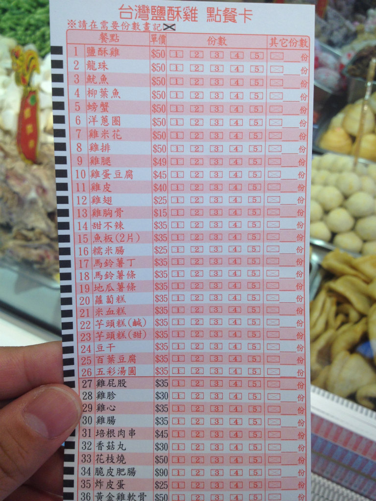 塩酥鶏(ユェンスージー)といえば、夜市とかで良く見かける食材がズラッとならんでいる揚げ物屋さんで、台湾でもポピュラーな食べ物です。