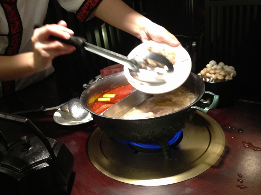 火鍋のお店はかなりの数があるので、ご希望のお店がどこかはわかりませんが、竹筒状の物を使ってスプーンで一口サイズに入れるタイプのお店も結構あると思います。