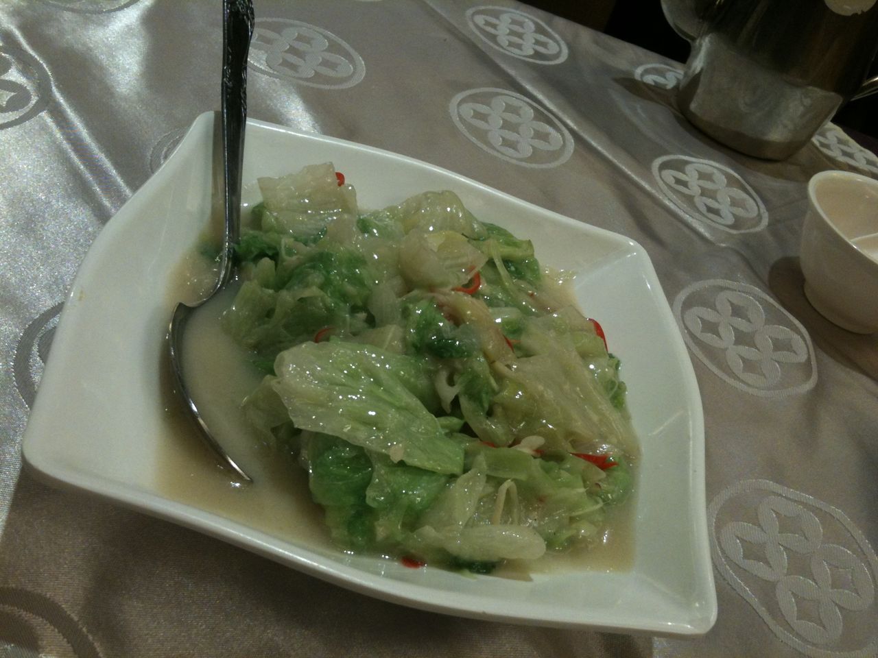腐乳とは豆腐を麹につけ塩水の中で発酵させたもので、それと赤唐辛子でレタスを炒めた一品です。腐乳って漢字を見るだけで臭そうなイメージですが、全くそのようなことはなく、発酵した味噌っぽいイメージの味でした。レタスがシャキシャキでピリ辛の唐辛子もアクセントがあり、レタス炒めの好きな私としては、かなり上位に入る一品でした。