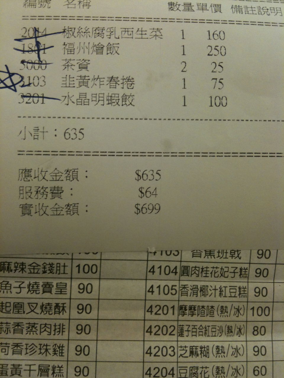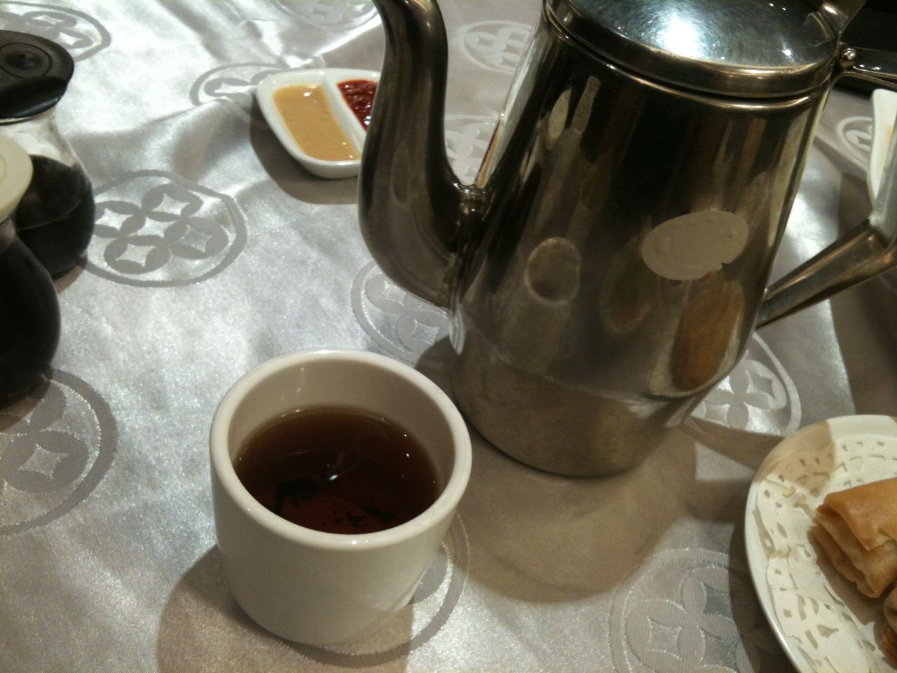 店員さんより、「ウーロン茶?プーアル茶?ジャスミン茶?」と聞かれ、ウーロン茶を頼みました。油を流す効果がある中国茶は、中華料理には必須ですね。尚、お茶はポットで来て、25元となります。