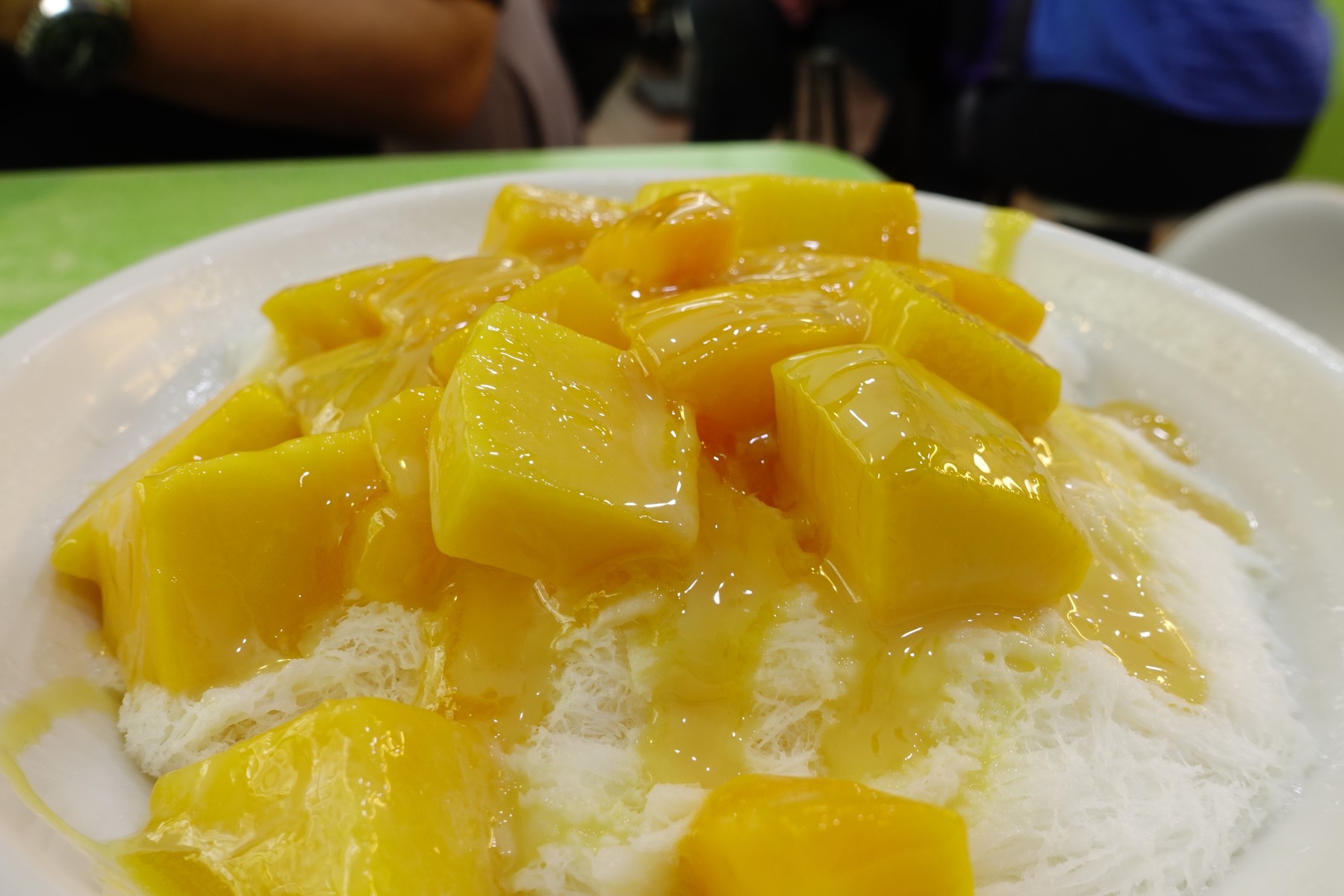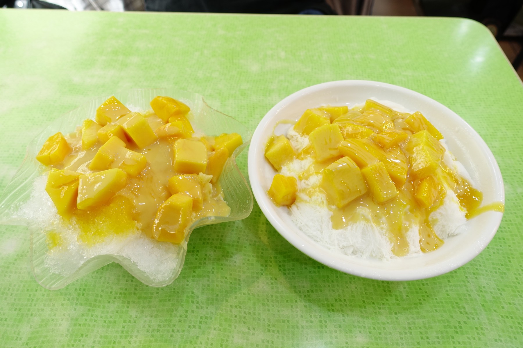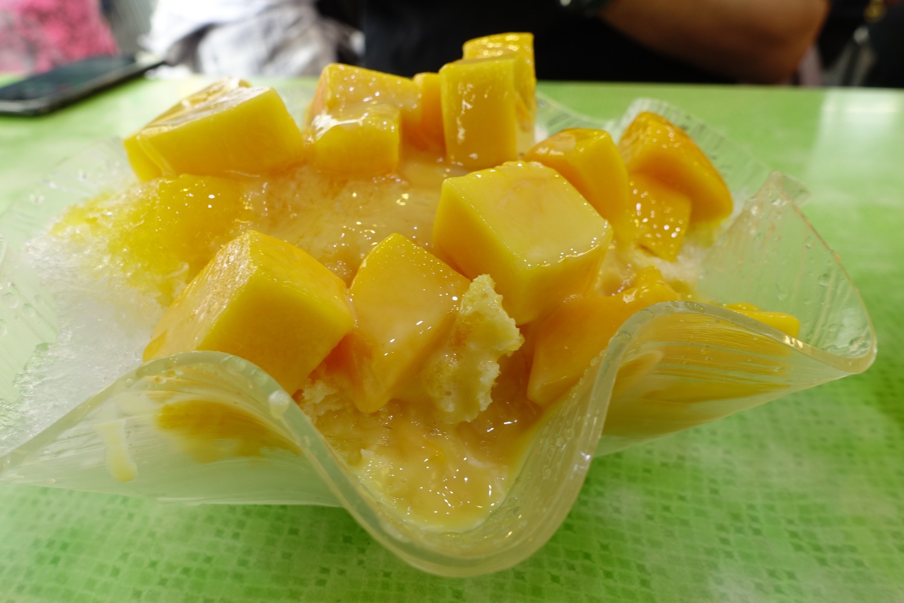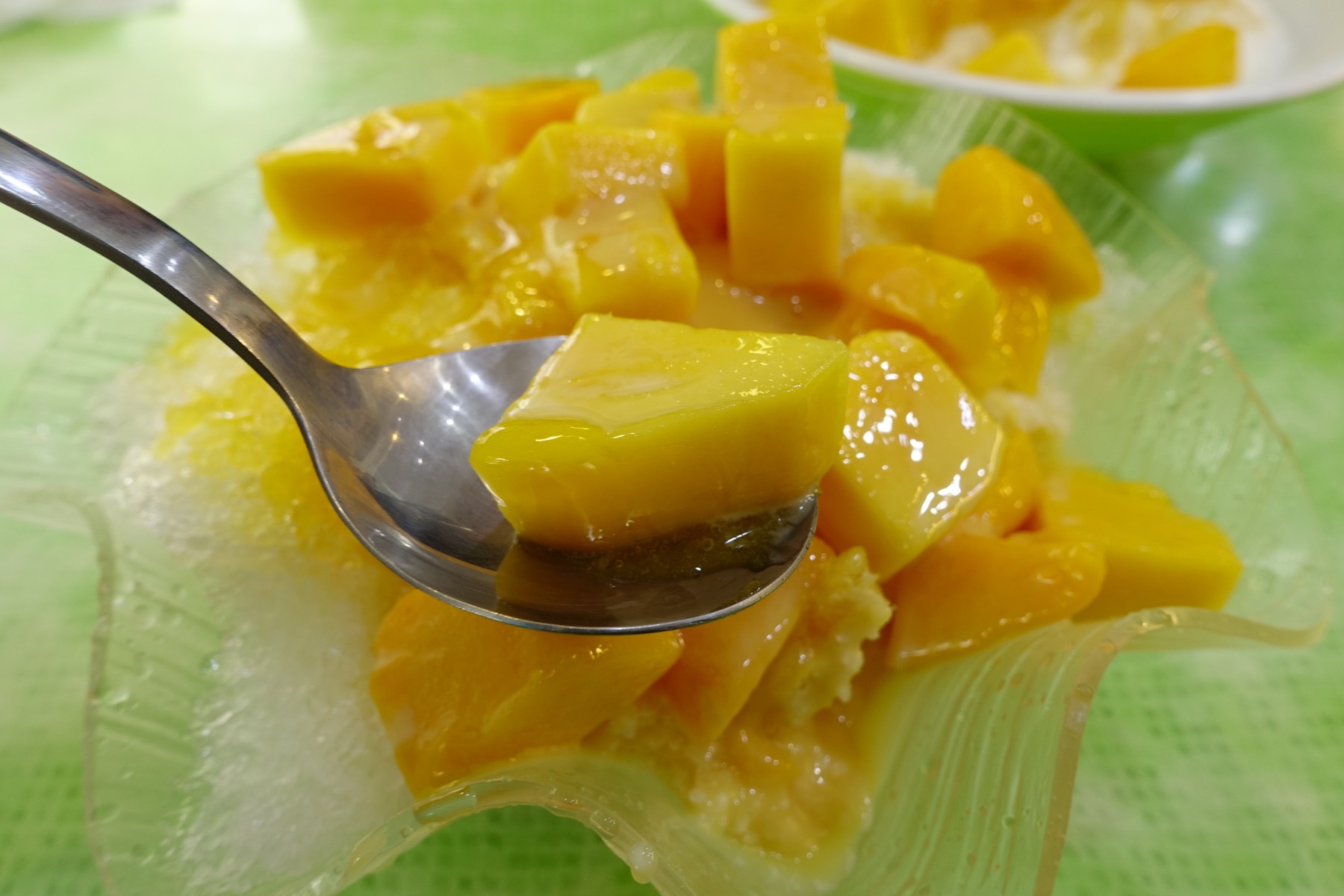 普通の氷を削ったかき氷の上にマンゴー、そしていっぱいの練乳がかかったかき氷。