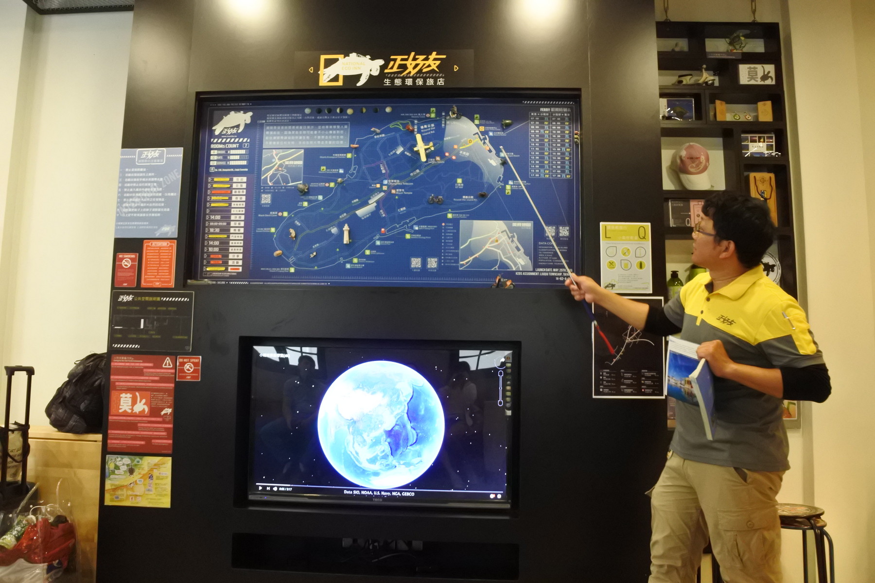 1階にあるテレビと地図を使って、小琉球の観光地はもちろんのこと、ウミガメの生態についても講義をしてくださいました。