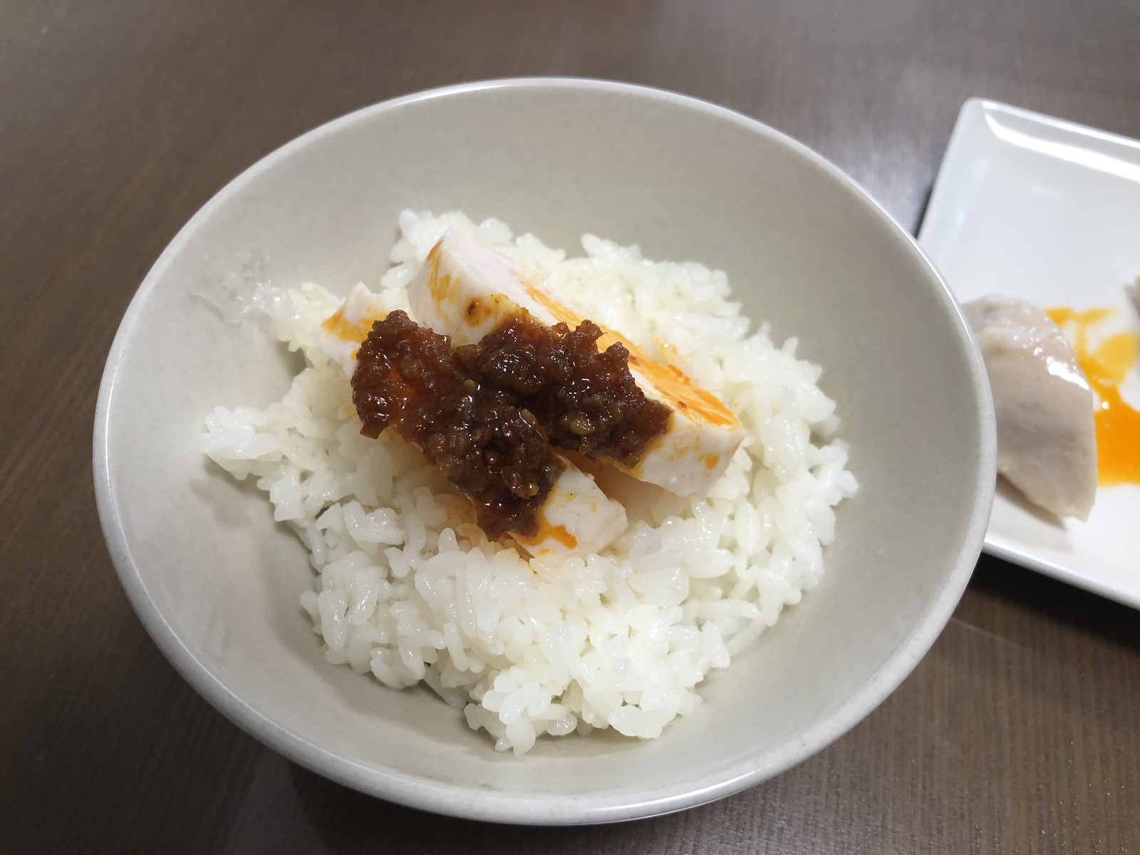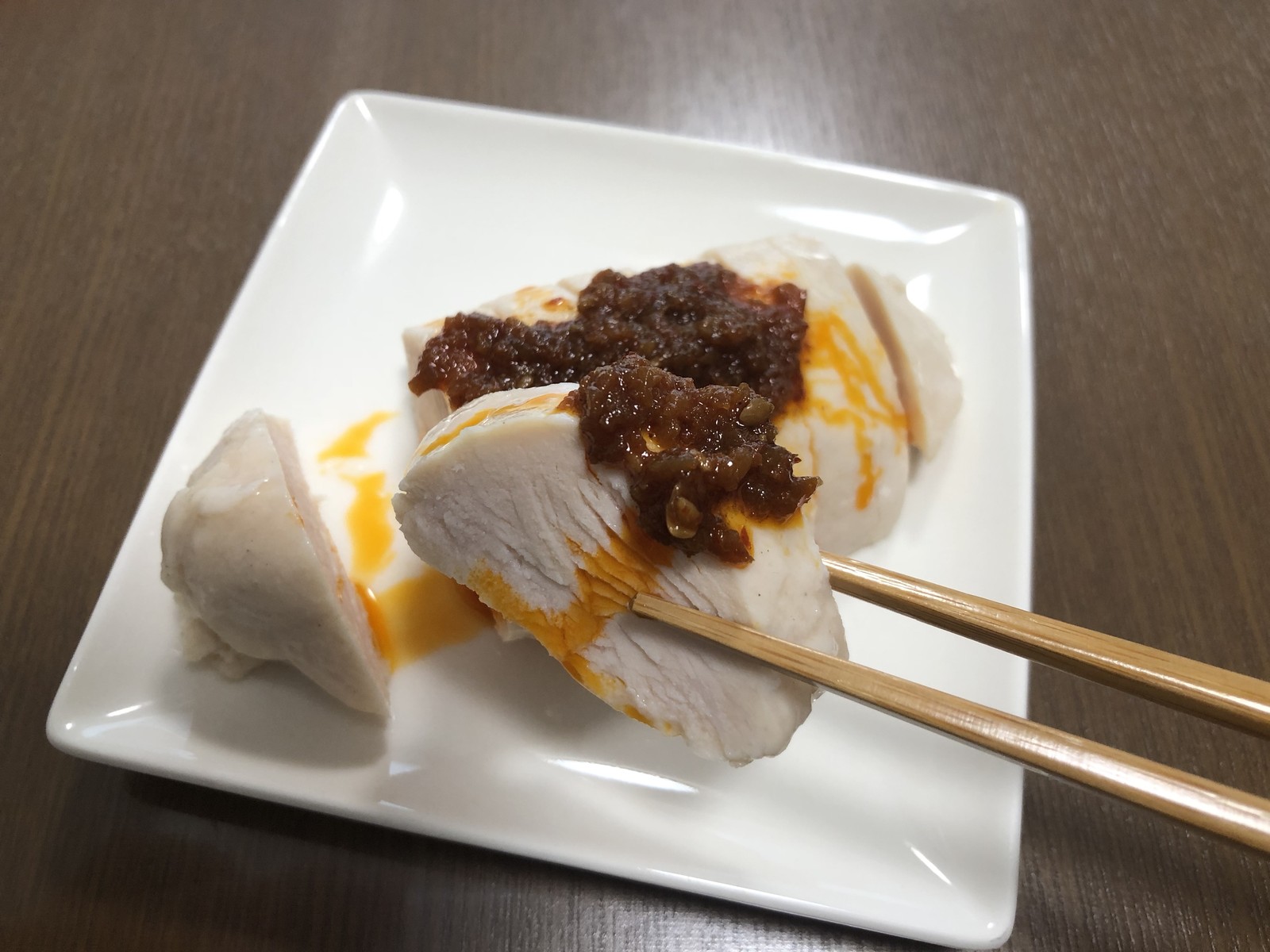 のせるだけ万能調味料 とのことですが、麻辣鶏(マーラージー)、口水鶏ともいう、大好きなアレを作ってみたくなったので、コンビニでサラダチキンを買ってきました。本当は骨付きの鶏肉の方が良いのですが、手間を省いてコンビニでこちらを調達。