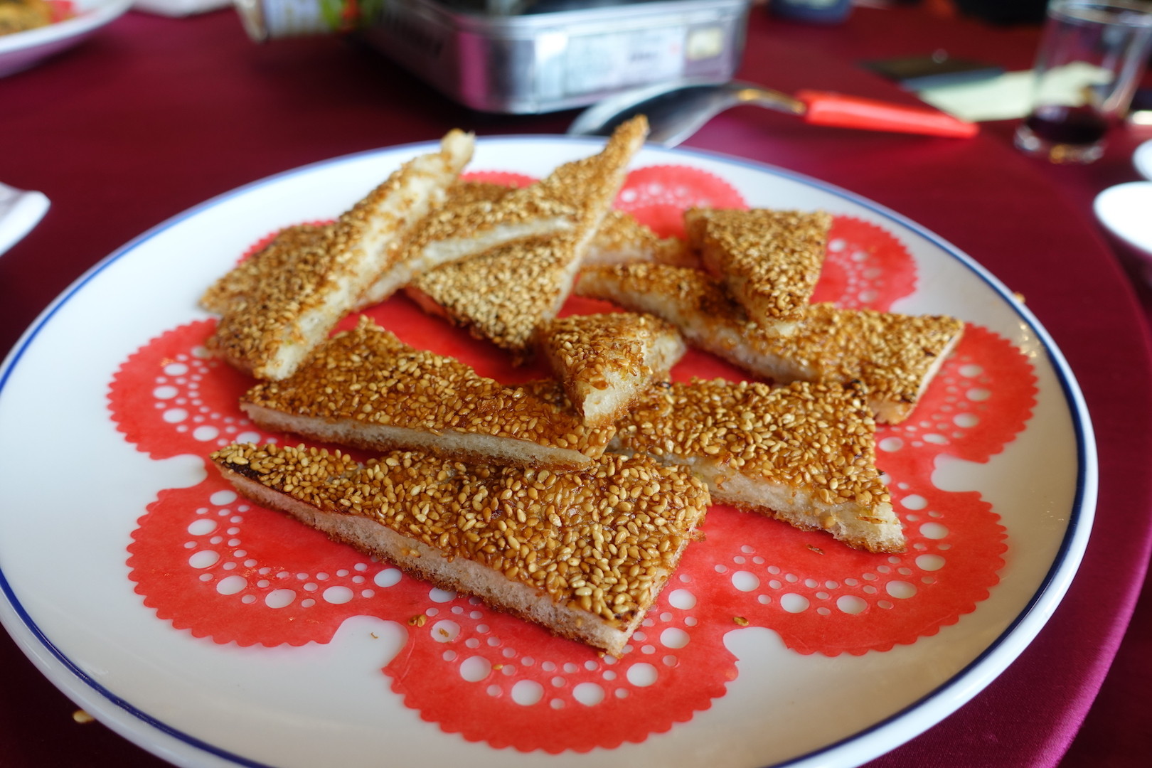 トーストにゴマと魚のペーストを付けて揚げたものです。