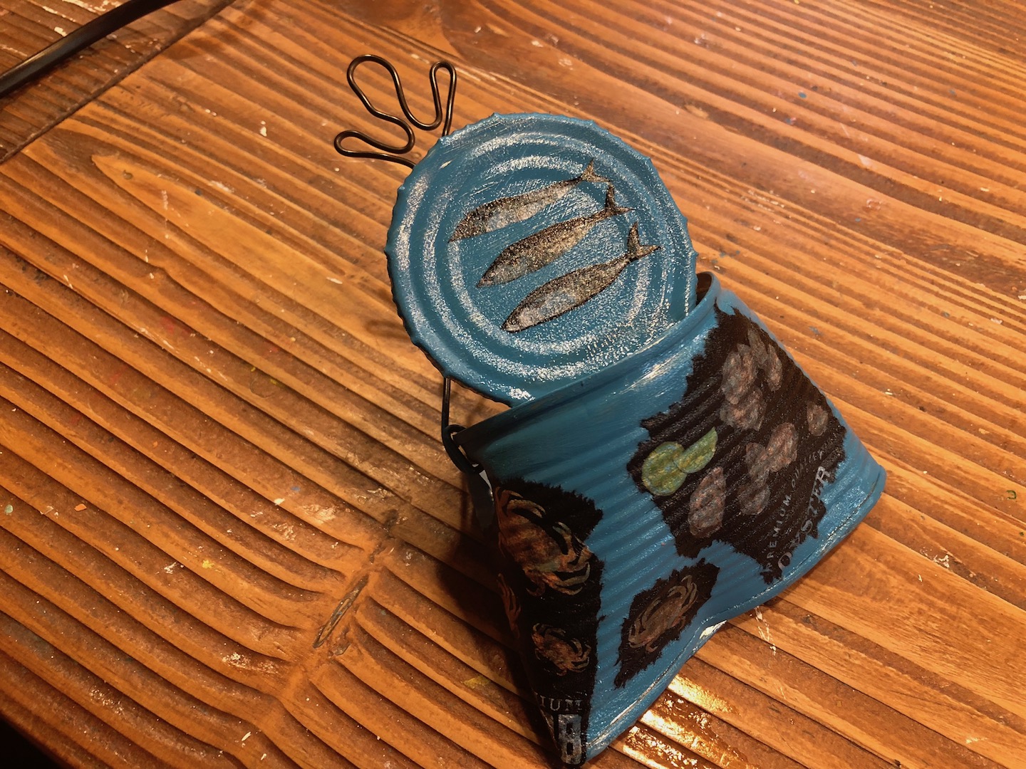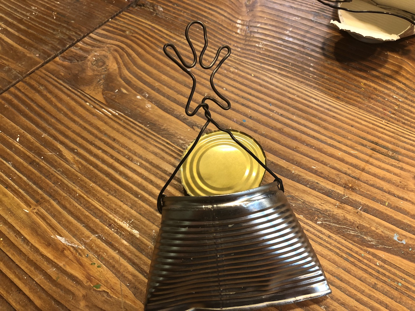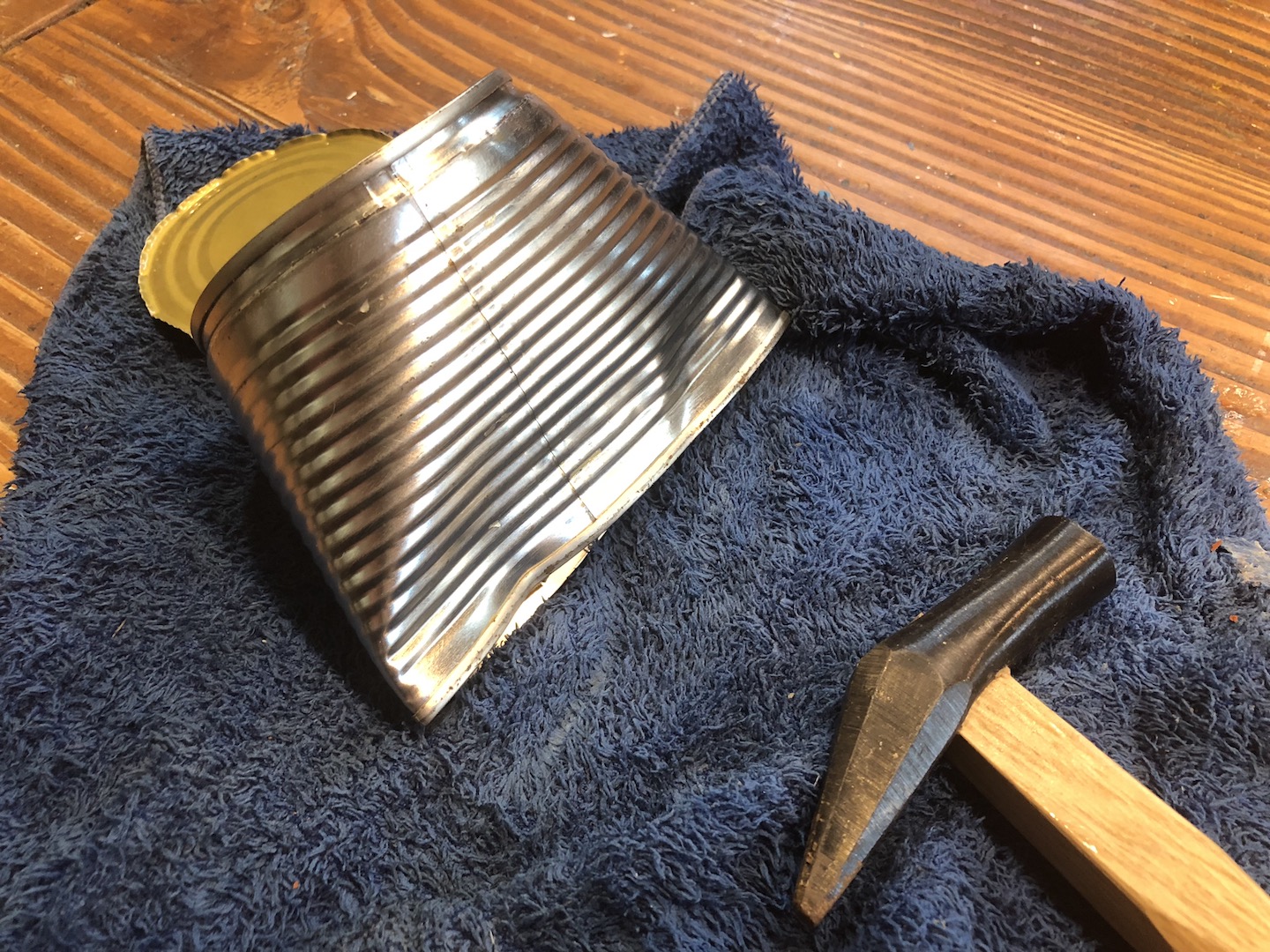 今回はこちらの空き缶を吊り下げられるプランターにするということで、まずはハンマーで形を整えます。