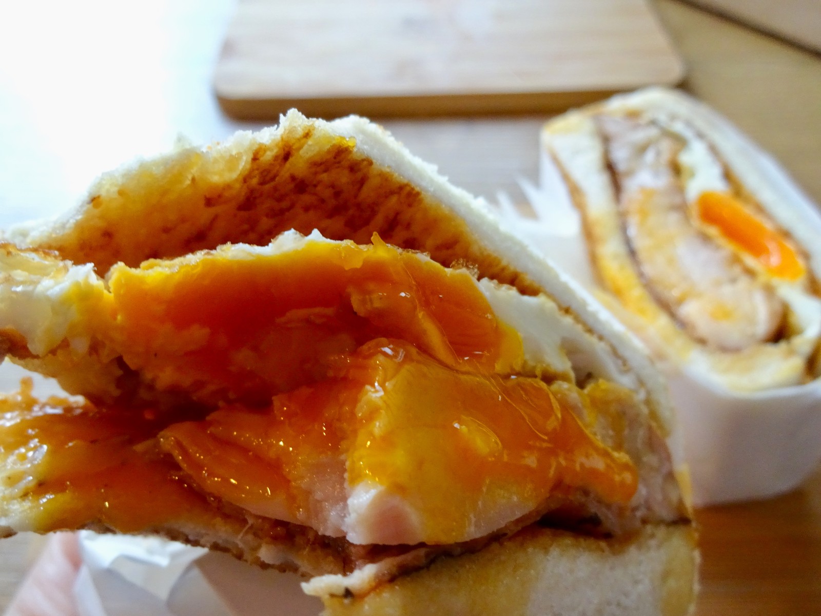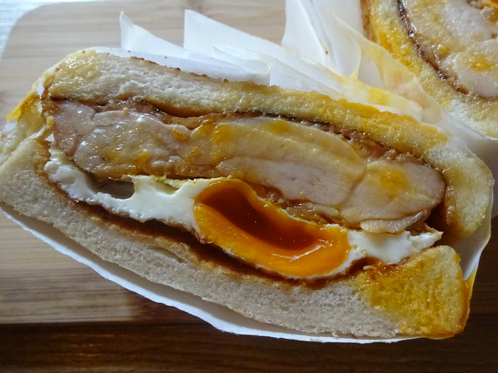 そしてパン以上に分厚いチキンと半熟の黄身!おいしそう!