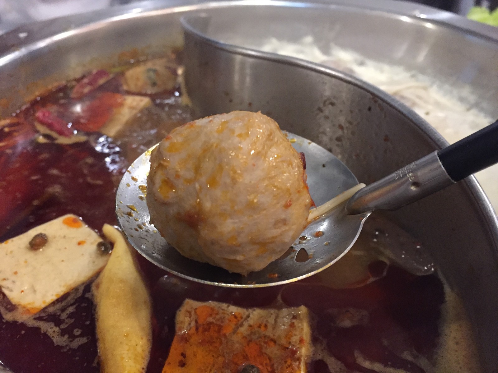 しいたけ味の貢丸は、麻辣のスープを吸ってピリ辛に。