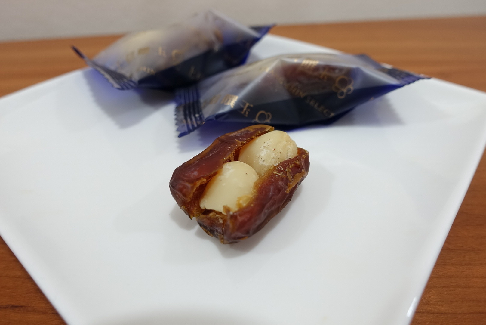 デーツ(ナツメヤシ)の間にマカデミアナッツが挟まったものです。