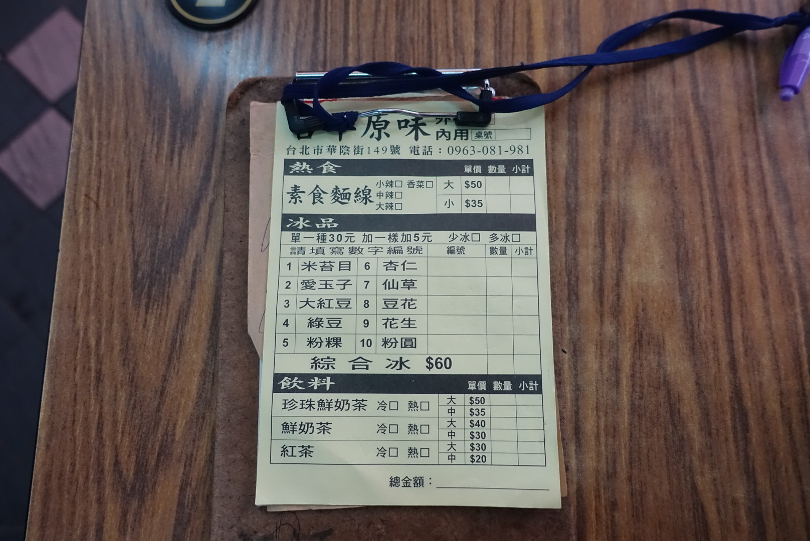 今回は麺線一択、辛さも選べるようですが、特にしるしは付けず、香菜だけにチェックを入れました。素食麺線(小)(スーシーミエンシェン)35元