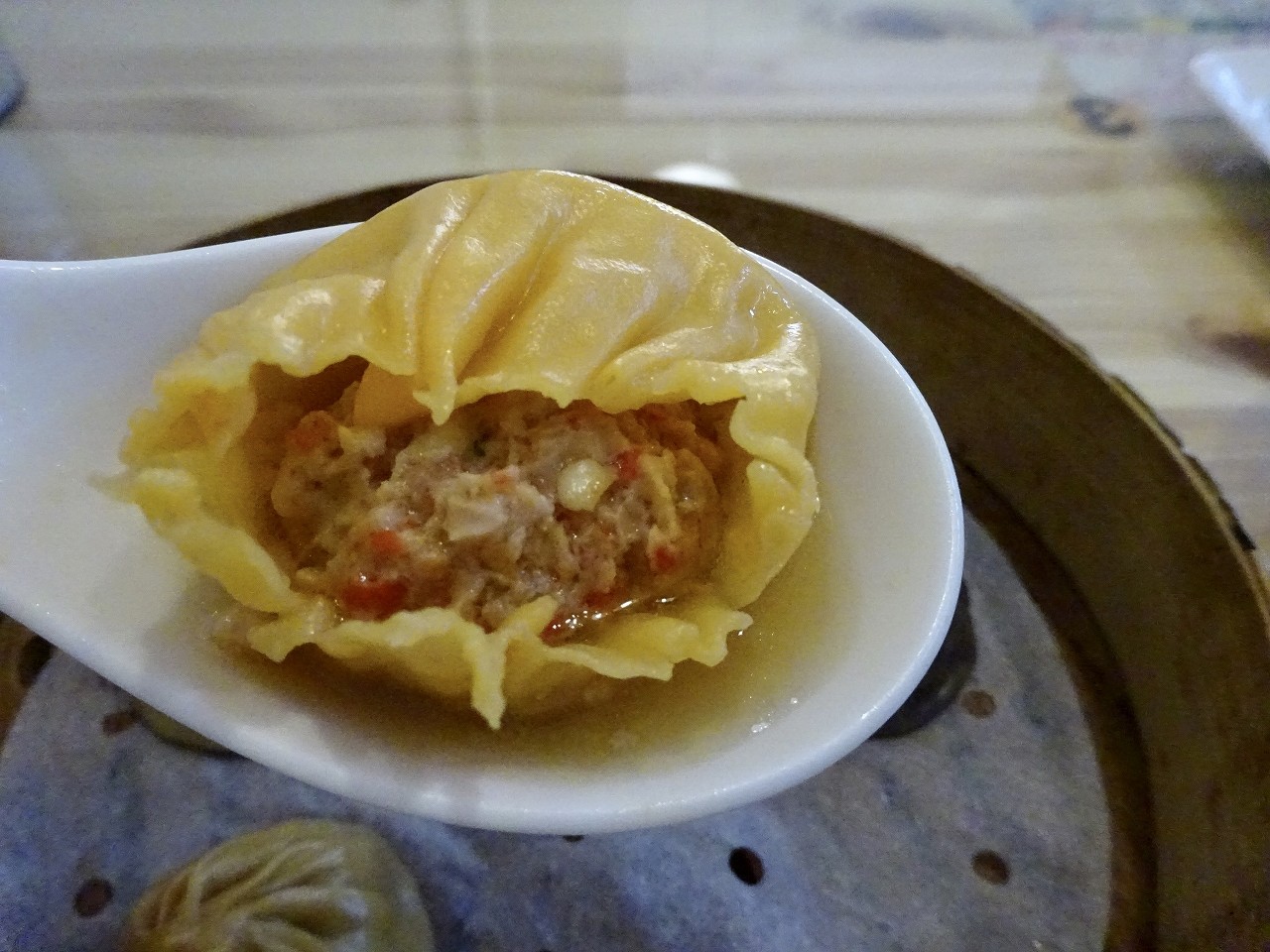 レンゲの上で傾けてみると、この通りスープたっぷり。