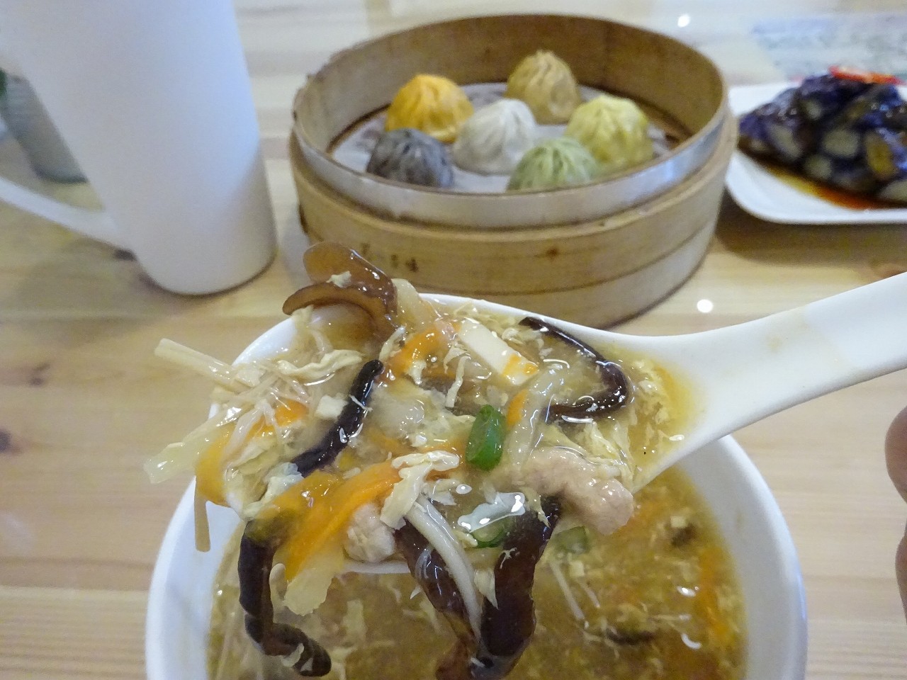 套餐はセットメニューのことで「Aセット 総合小籠包」という意味合いですね。まずはスープを一口いただきます。