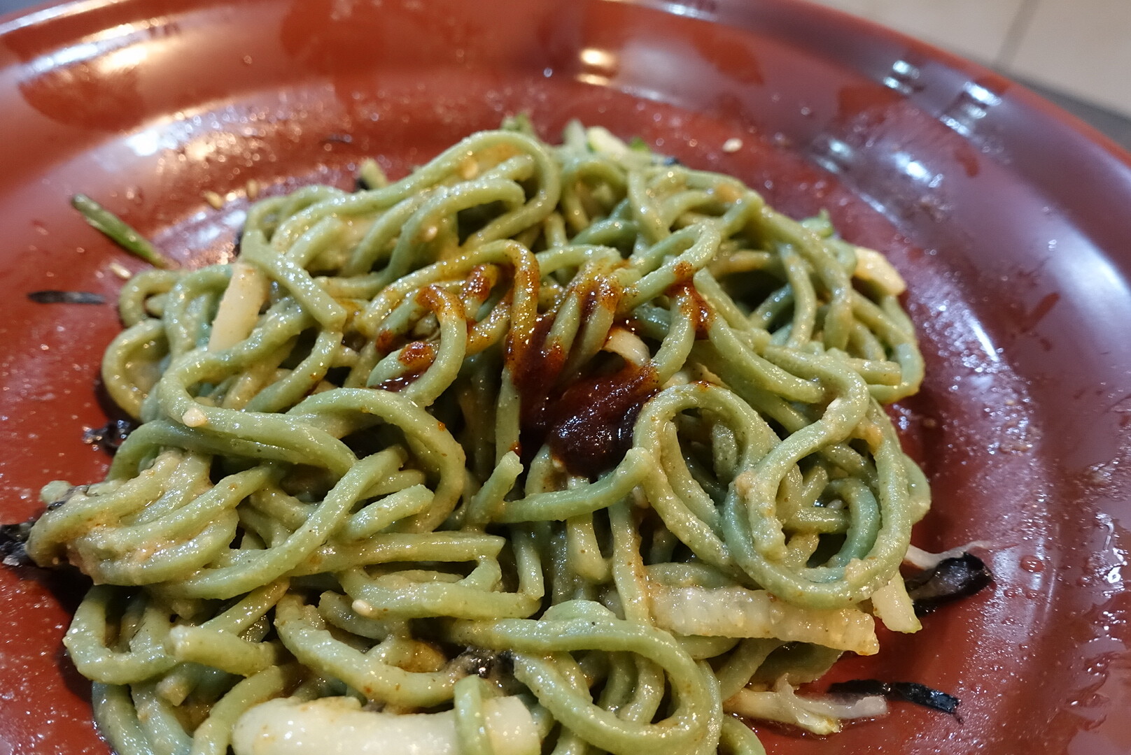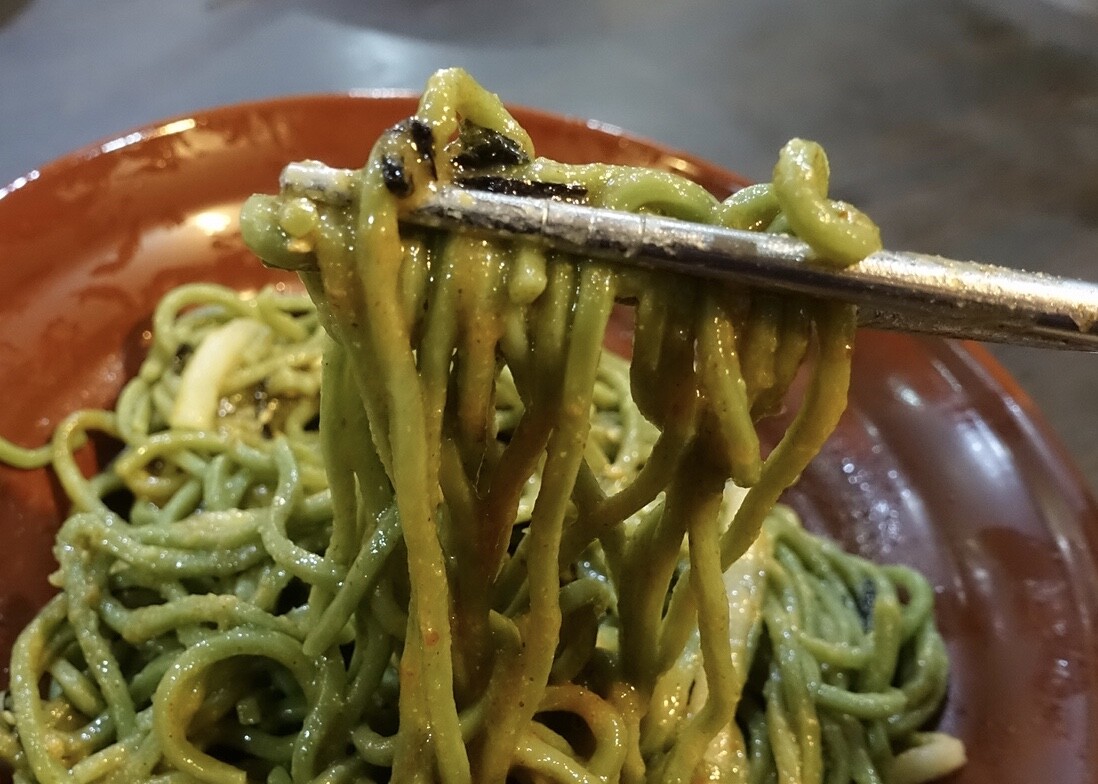 ということで、クロレラ入りの珍しい緑色の涼麺のご紹介でした。