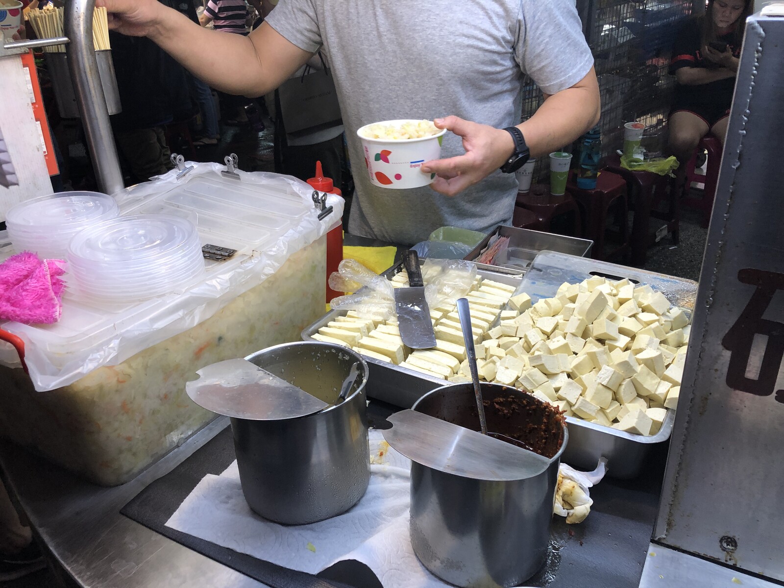 揚げたての臭豆腐の上にキャベツの酢漬けである「泡菜」がどさっとのり、上からニンニク醤油や辣椒醤をかけて頂きます。