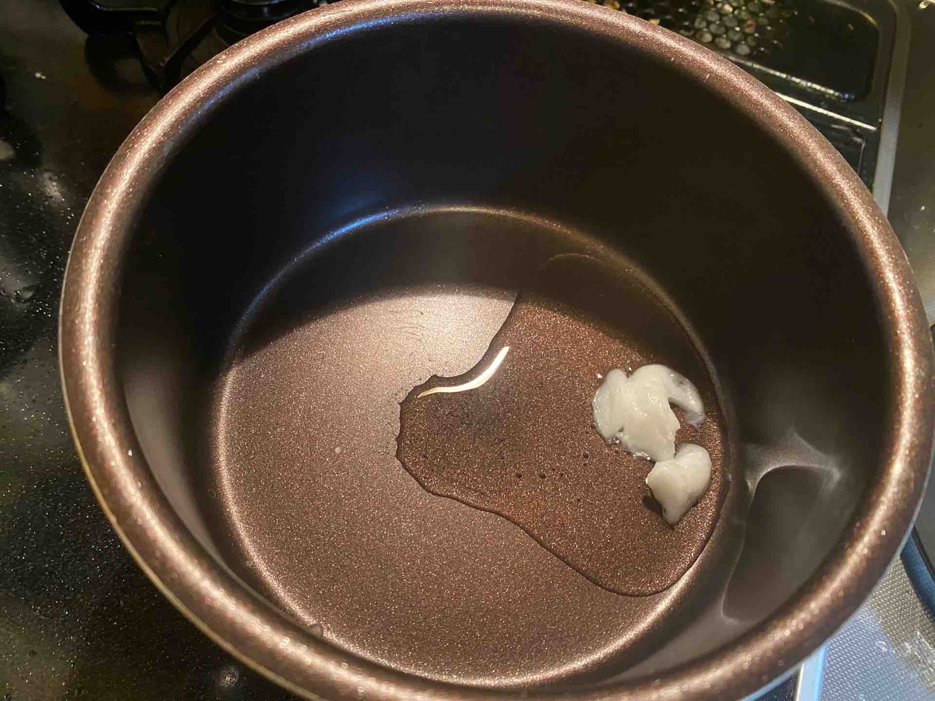 弱火で火をかけ、全体が溶けたらフライドオニオンを大さじ1杯いれます。