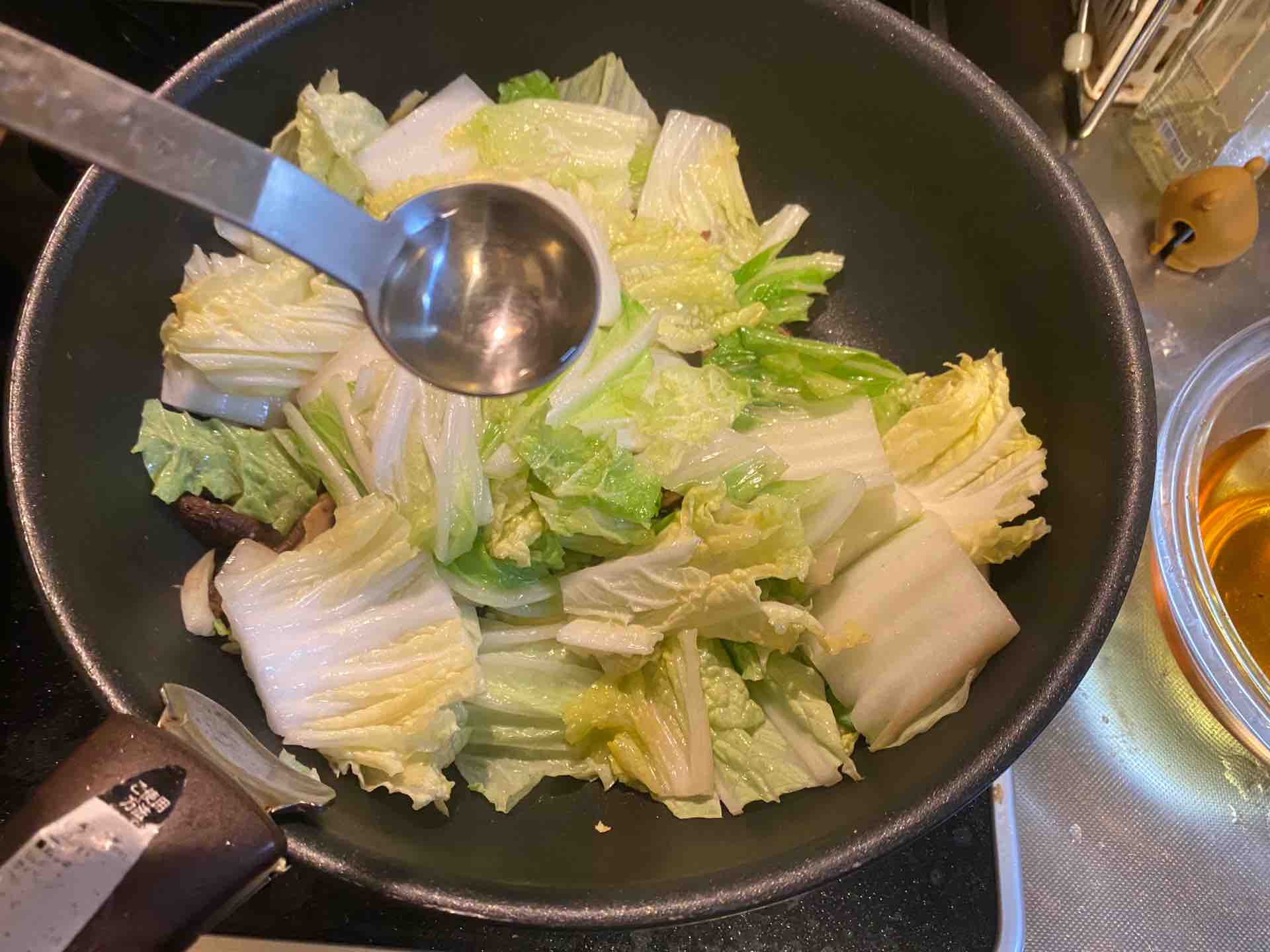 白菜が少ししんなりするまで炒めたら、シイタケとエビを入れていた出し汁を投入します。