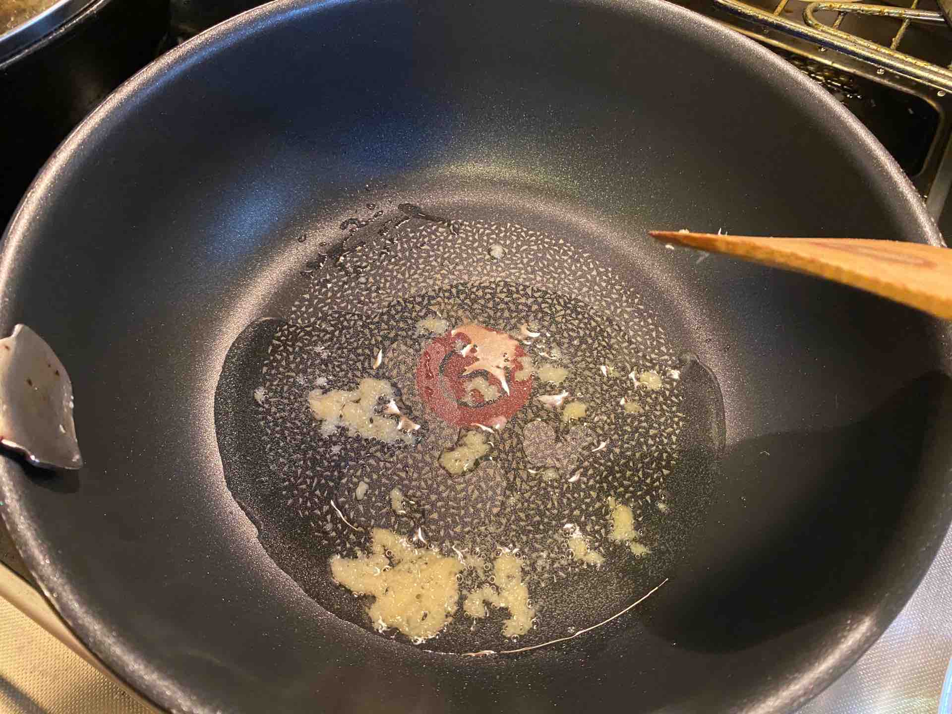 深めのフライパンに油をひき、ニンニクチューブと生姜チューブを少量入れます。