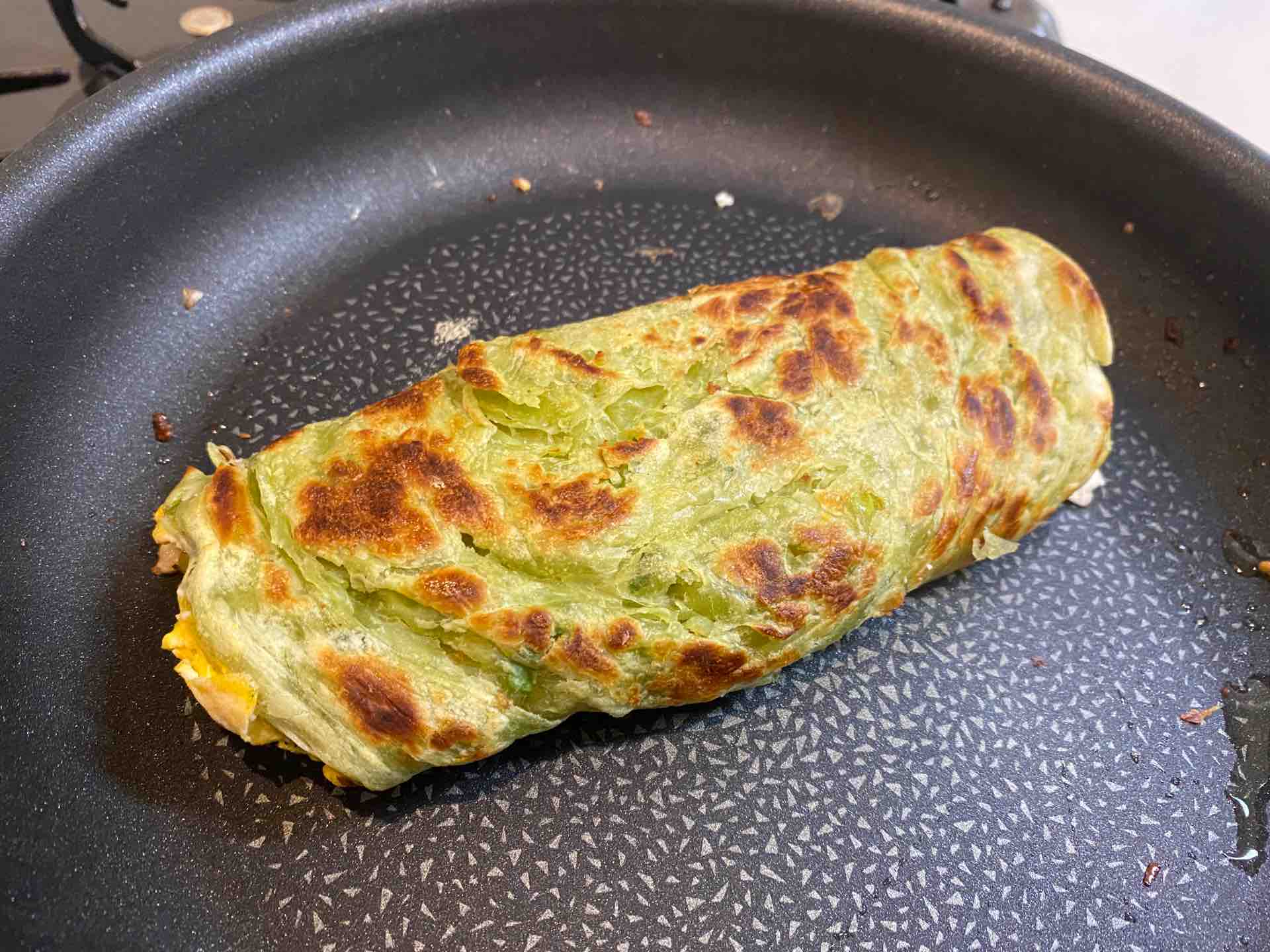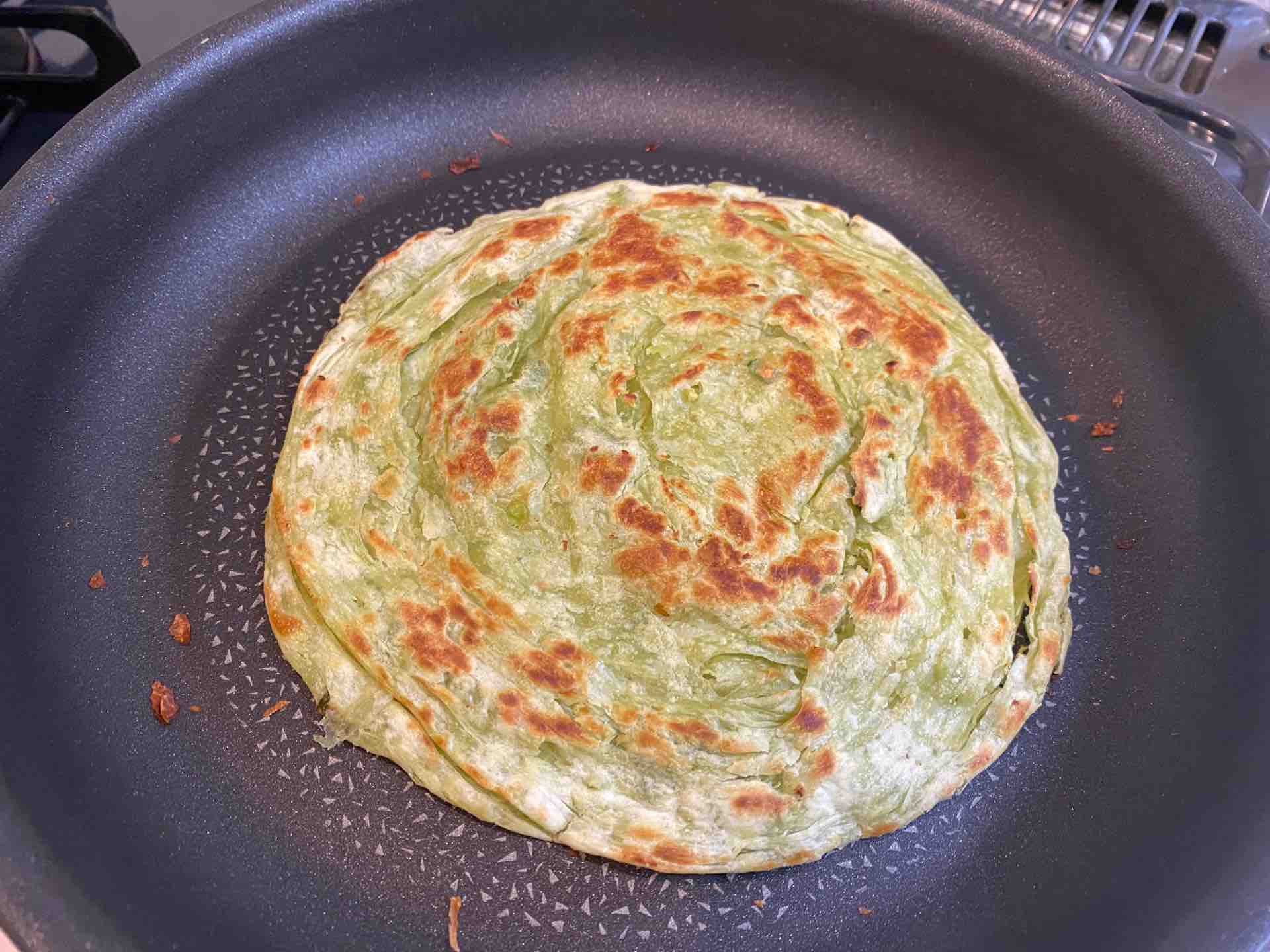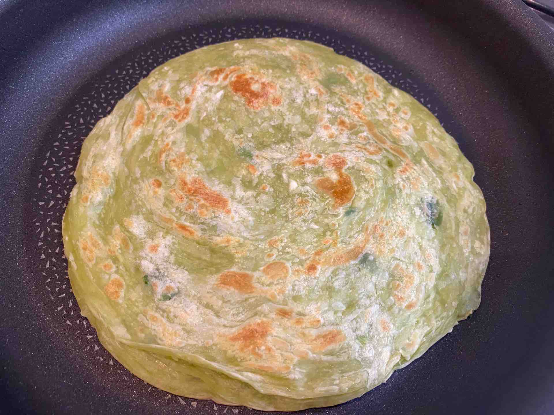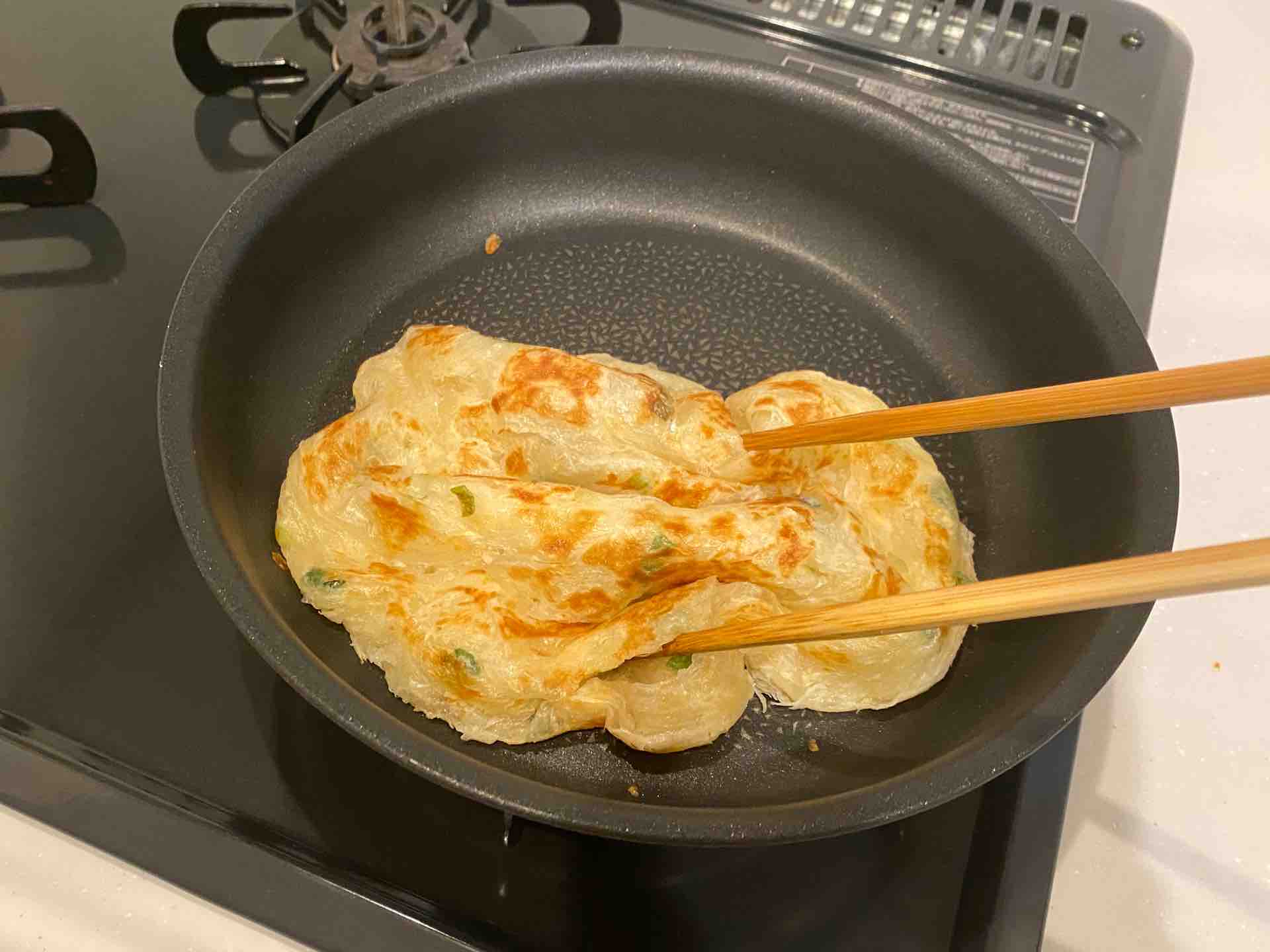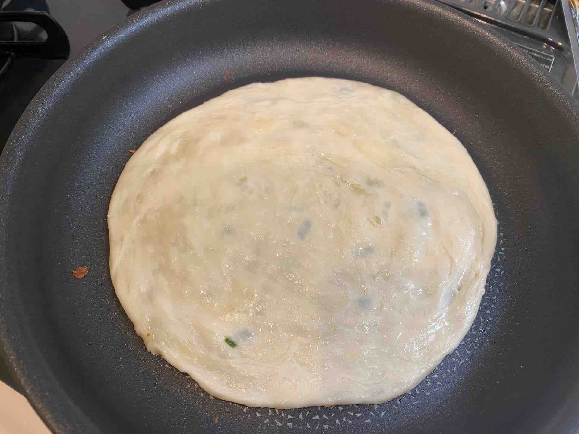 段々と凍っていた葱抓餅が溶け、表面にふつふつと油が浮いてきます。