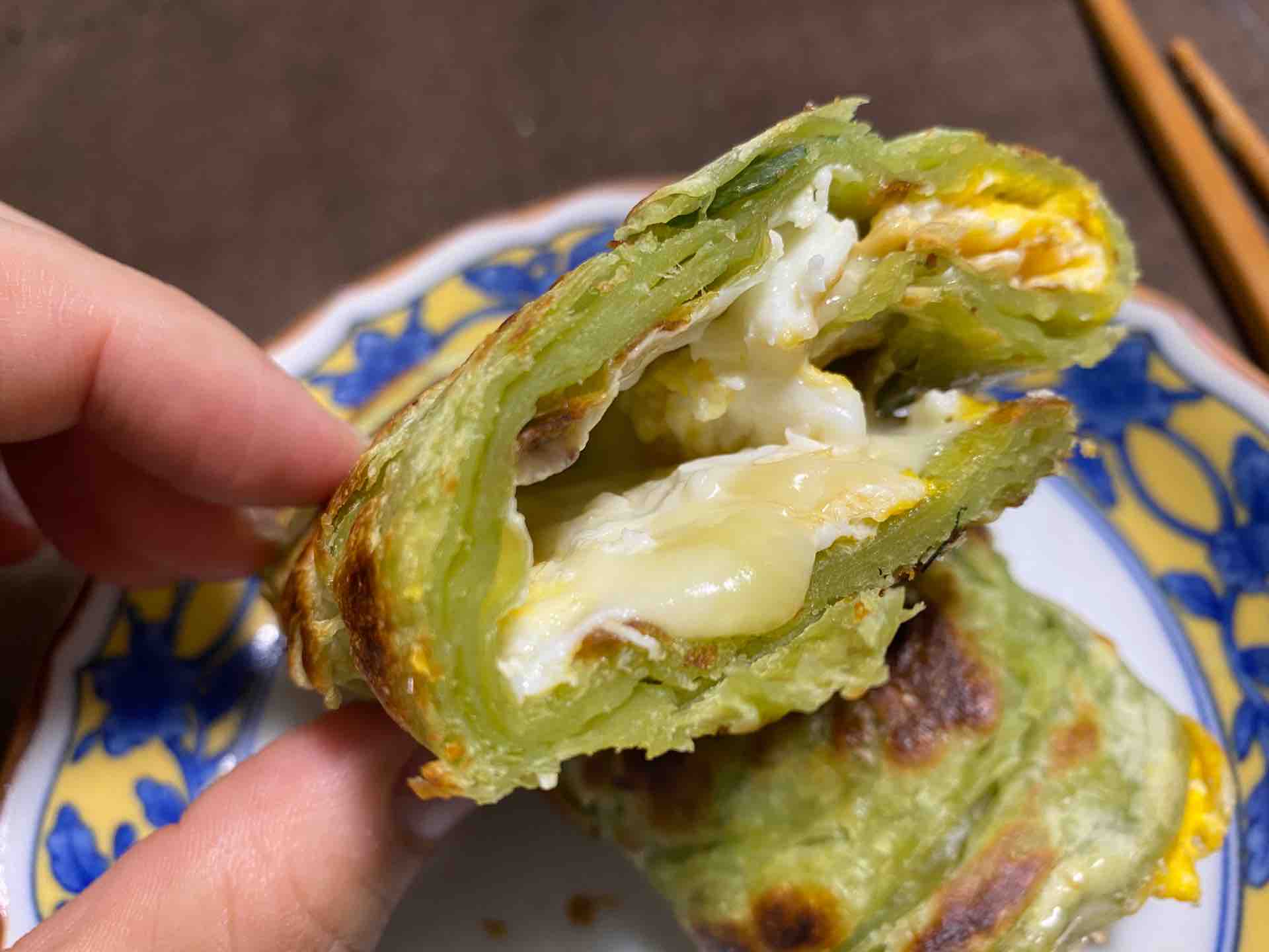 葱抓餅の味にタマゴの甘みとチーズの塩気が混じって最高です。
