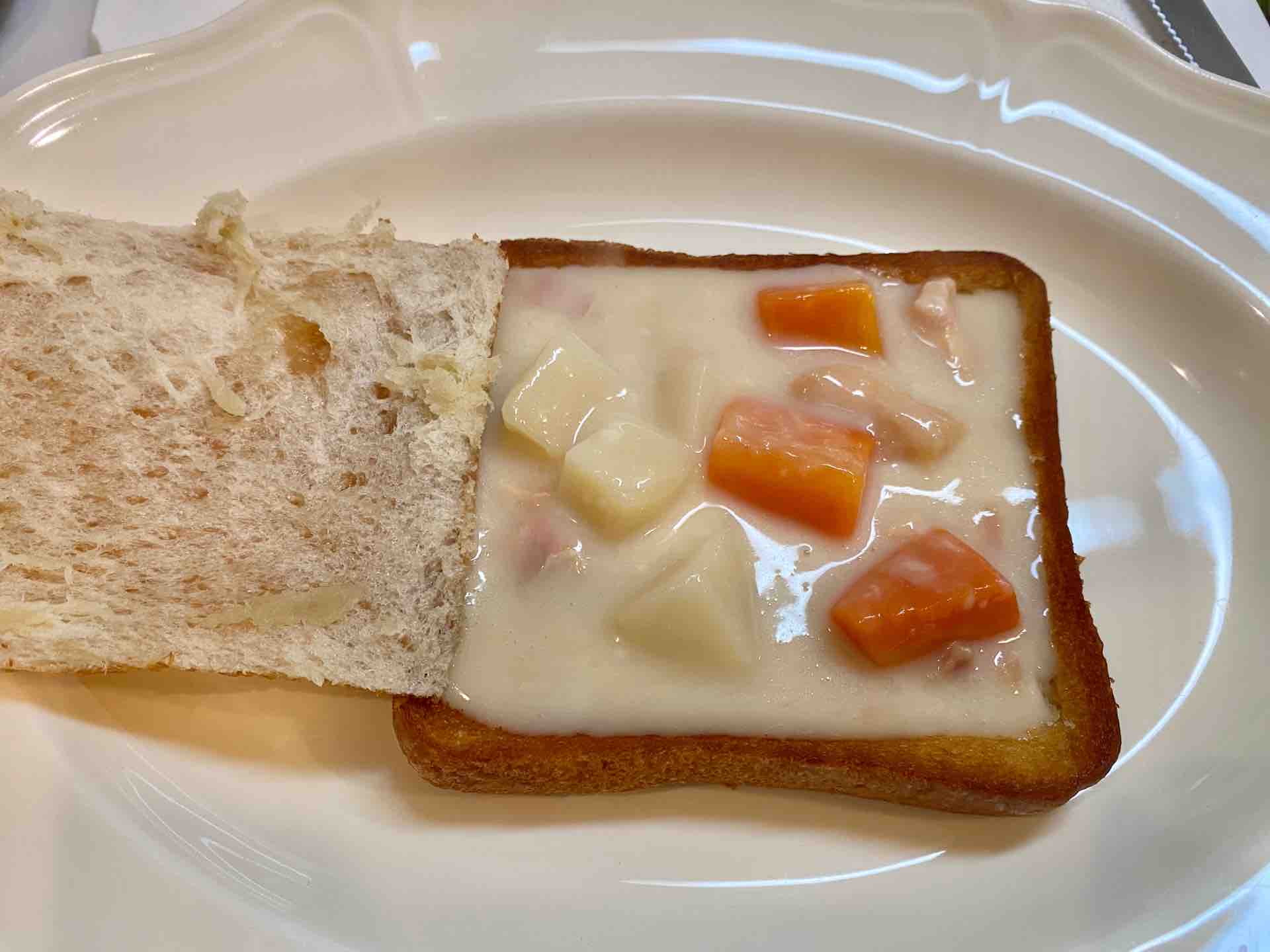 ハウスの北海道シチューが美味しいという話もありますが、この揚げ食パンとの相性バッチリです!