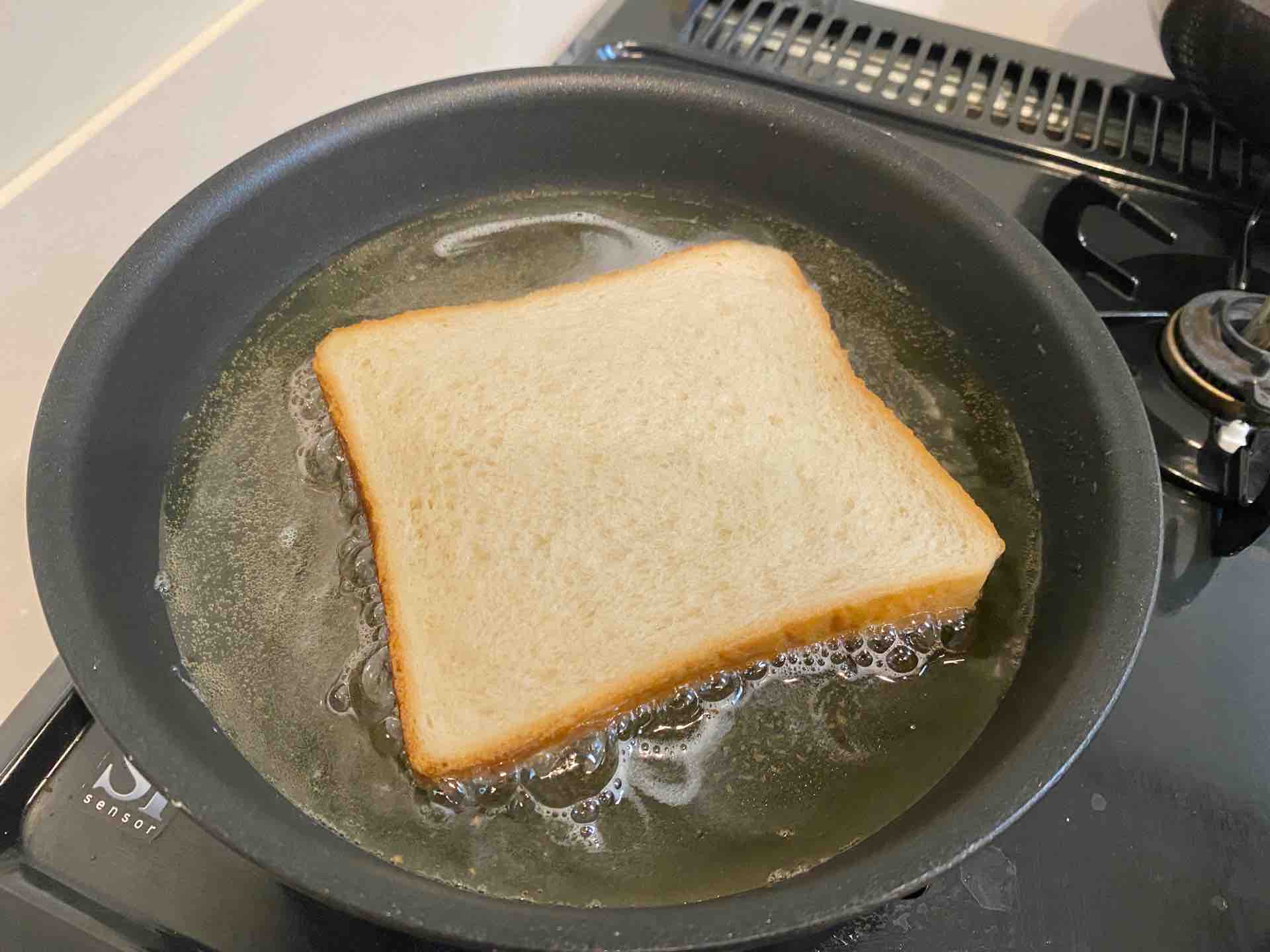 油を適量入れたフライパンを火にかけ、パンを入れます。