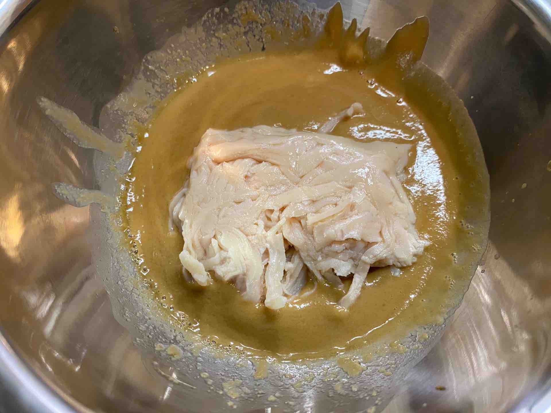 全体が混ざったら、ほぐしチキンを半分ほどタレの中に投入します。