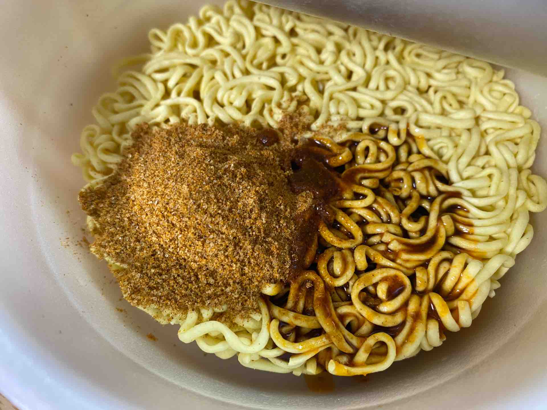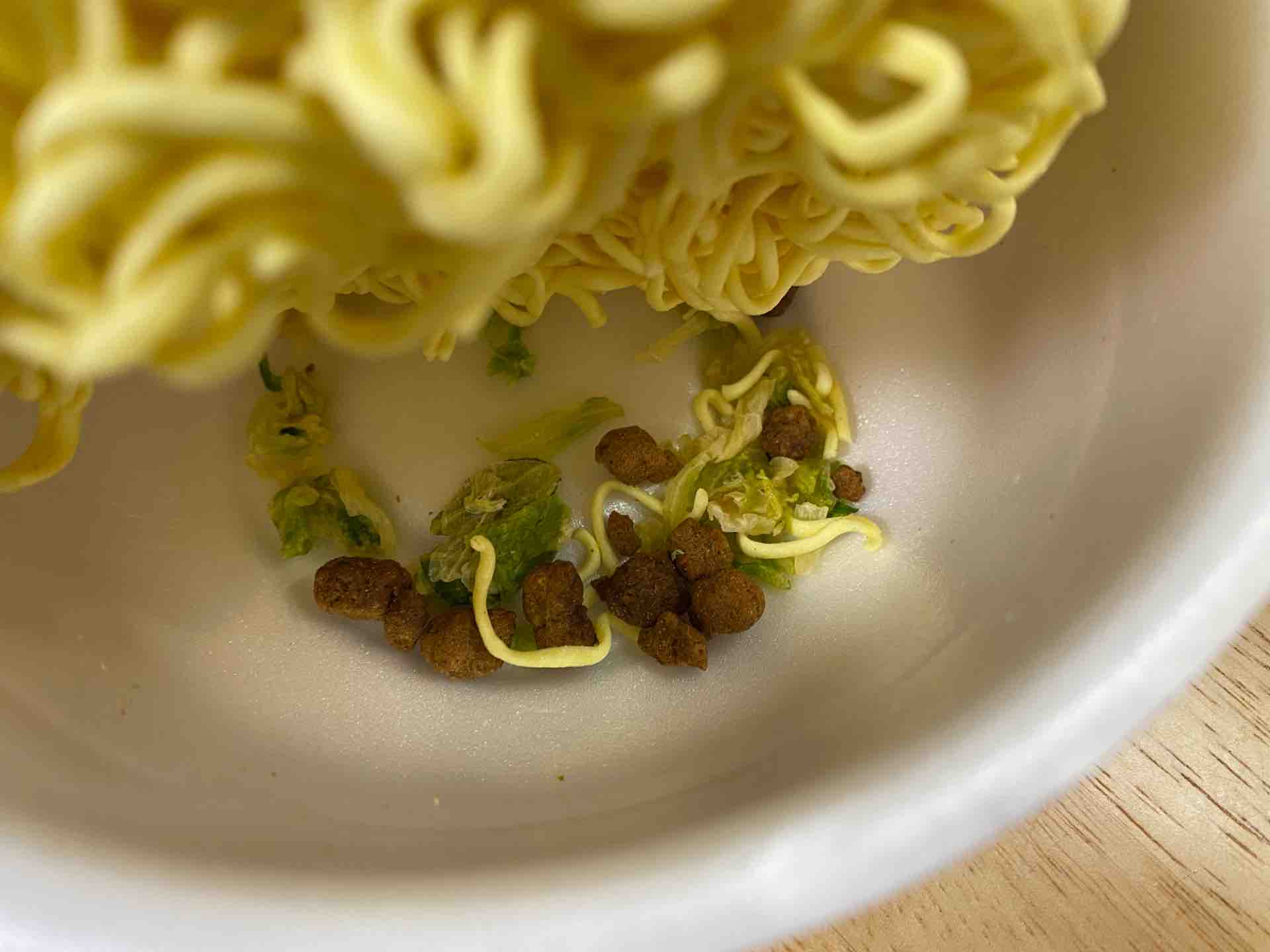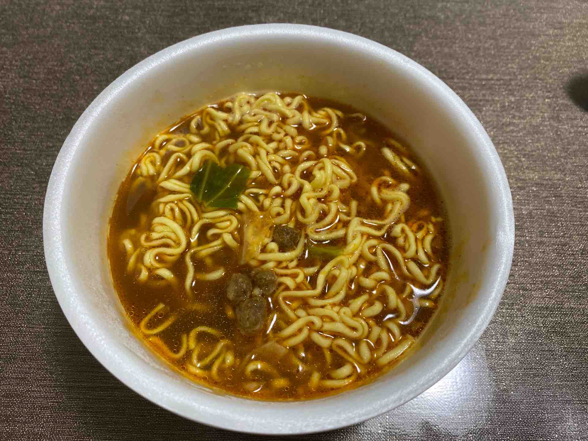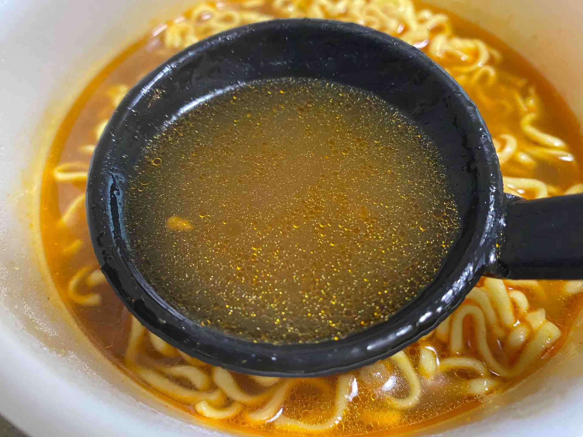 お湯を入れる前に粉末スープをぺろりと舐めてみると、カレー風味のような奥の方でクミンがピリッと効いています。液体スープはとがった辛さを感じました。