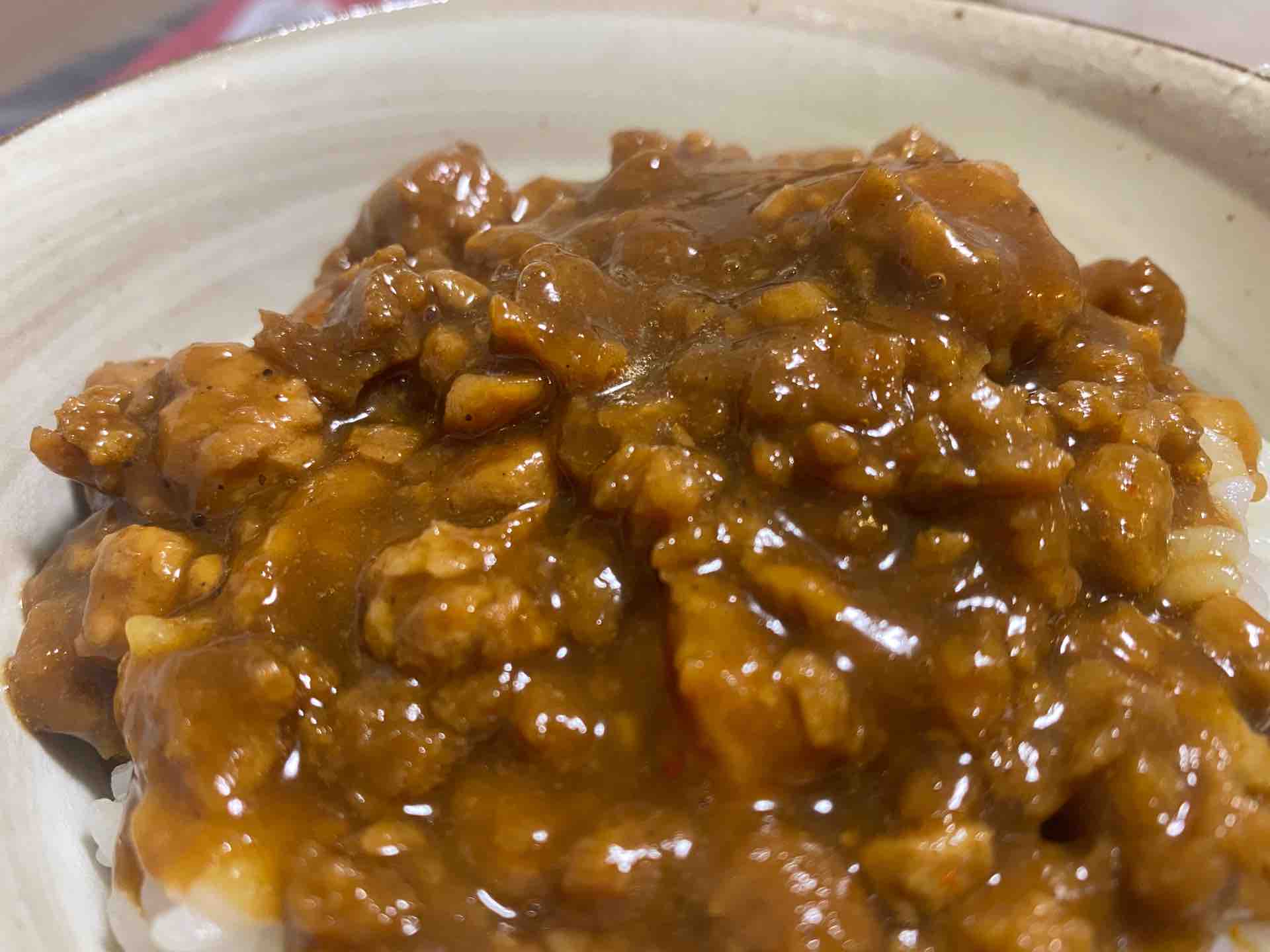 一瞬キーマカレーのようにも見えますが、具はかなり粗挽きのお肉、タレはトロミが強いようです。