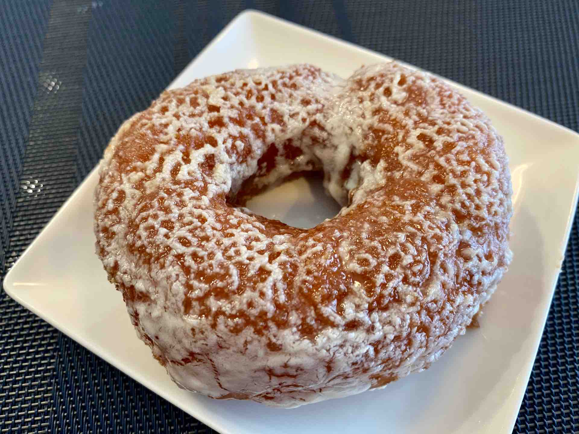 練乳と砂糖が溶けてドーナツに染み込みつつあり生地はジュワジュワ、溶けた砂糖が固まりつつあるので、周りが歯に絡みつくようなカリっと感があります。