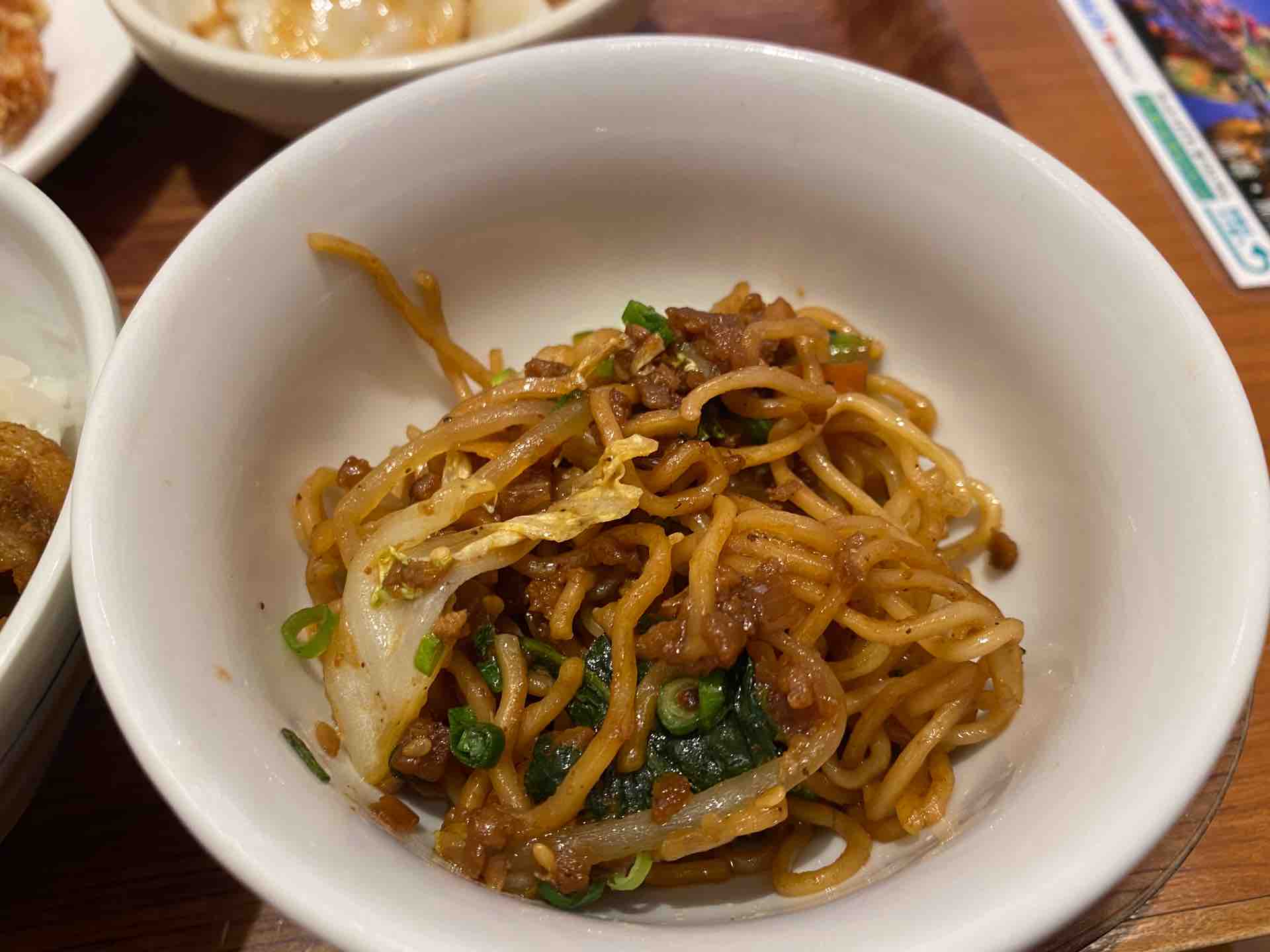台湾には炒麺(チャオミェン)という焼きそばはありますが、台湾炒麺として味が確立されたものはなく、お店によっても味は様々なので、これはなんとなく名古屋発祥の台湾ラーメンを焼きそば風にしていると感じました。味付けはオイスターソースを使っており、具材は挽肉や野菜が入っています。味は悪くありませんが、少しピリ辛な味付けも「台湾まぜそば」っぽいです。