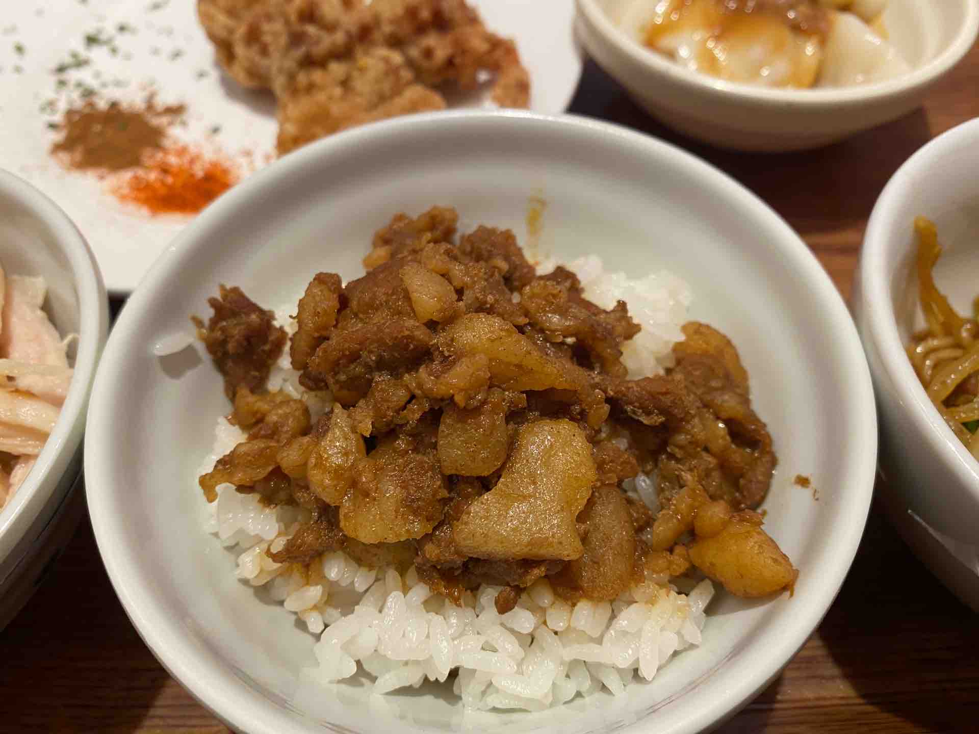 豚ひき肉と脂身が多い豚バラ肉を両方使っているようです。トロトロ肉ではなく肉感があり、また椎茸やタケノコなど、余計なものは一切入っていません。一口頂くと、うん、これは個人的に好きな魯肉飯で美味しい!