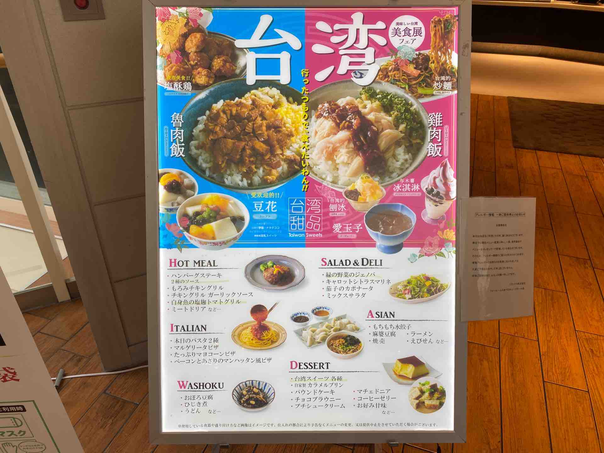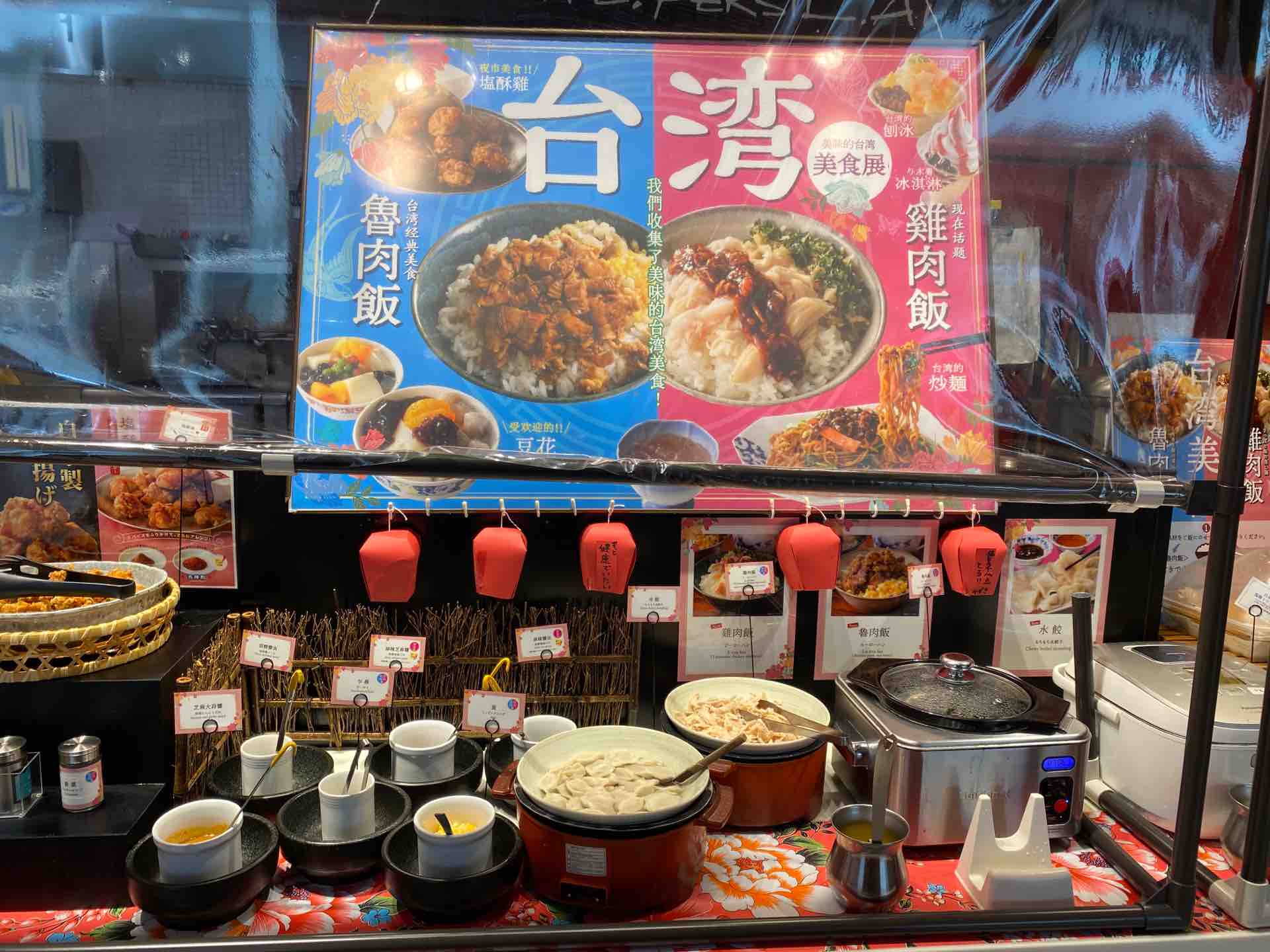 ハンバーグやチキンなどの洋食、パスタやピザなどのイタリアン、麻婆豆腐や点心などの中華、お惣菜などの和食、サラダなどに加え、今回の台湾フェアではいくつかの台湾料理を食べることができます。例えば、台湾屋台飯の代名詞でもるスパイスを効かせた豚肉がのった「魯肉飯(ルーローハン)」や、日本人にも大人気なほぐした鶏肉をのせた「鶏肉飯(ジーローハン)」、独特なスパイスが香る一口から揚げの「塩酥鶏」などなど。デザートには、愛玉子や豆花などを味うことができるとのことで、一つ一つレビューしたいと思います。