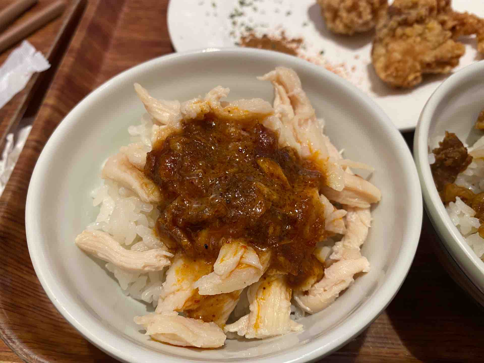 鶏肉飯とはほぐした鶏肉を白飯のうえにのせ、上からソースを掛けたものです。お店には「麻辣醤油」と「麻辣芝麻醤」という名前の2種類のソースがあり、それぞれ試してみました。