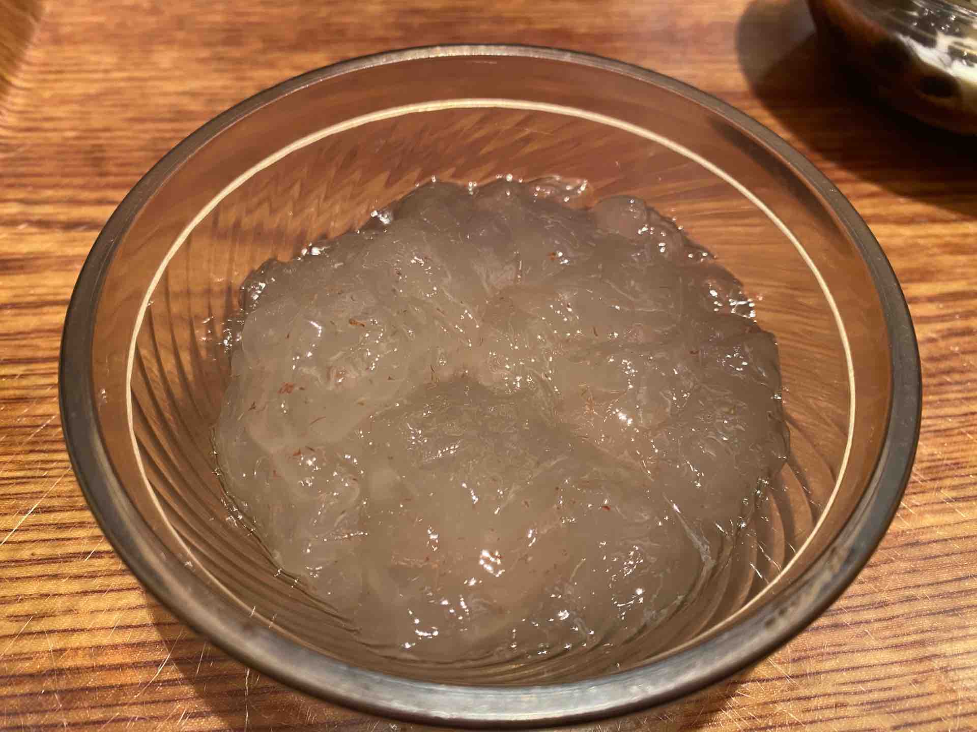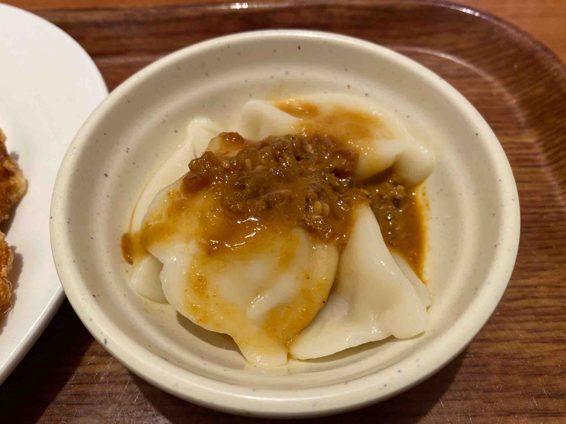 冷たい水餃子は初めてなのですが、白玉のように皮がモチモチとしており、意外と美味しかったです。
