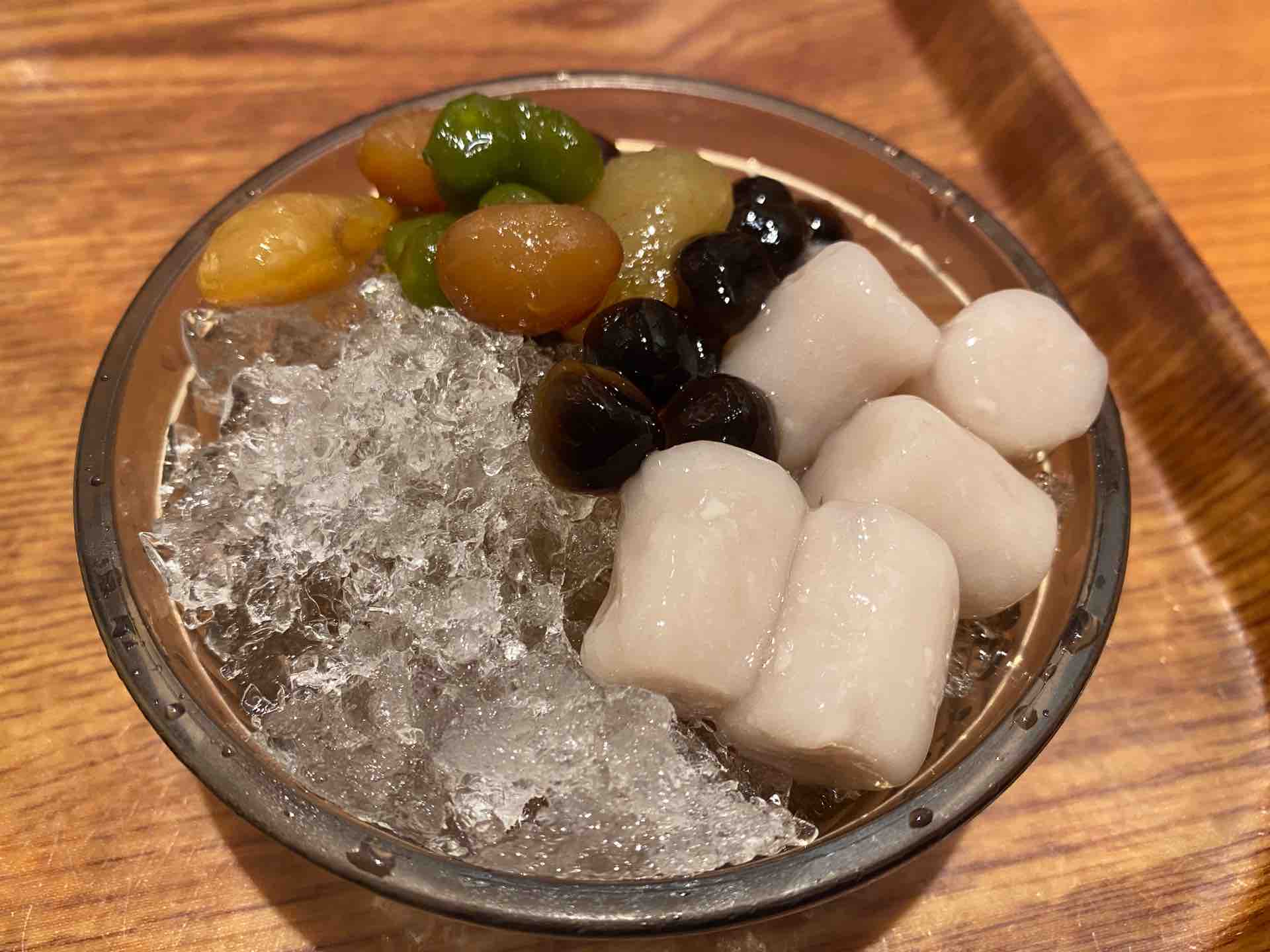 ブッフェでは、自分で氷を入れてかき氷を作るのですが、削り方が選べるので、台湾の刨氷(かき氷)らしく、一番荒く削ってみました。トッピングは豆花にも使用した芋圓とタピオカ、甘い豆類をのせてみました。
