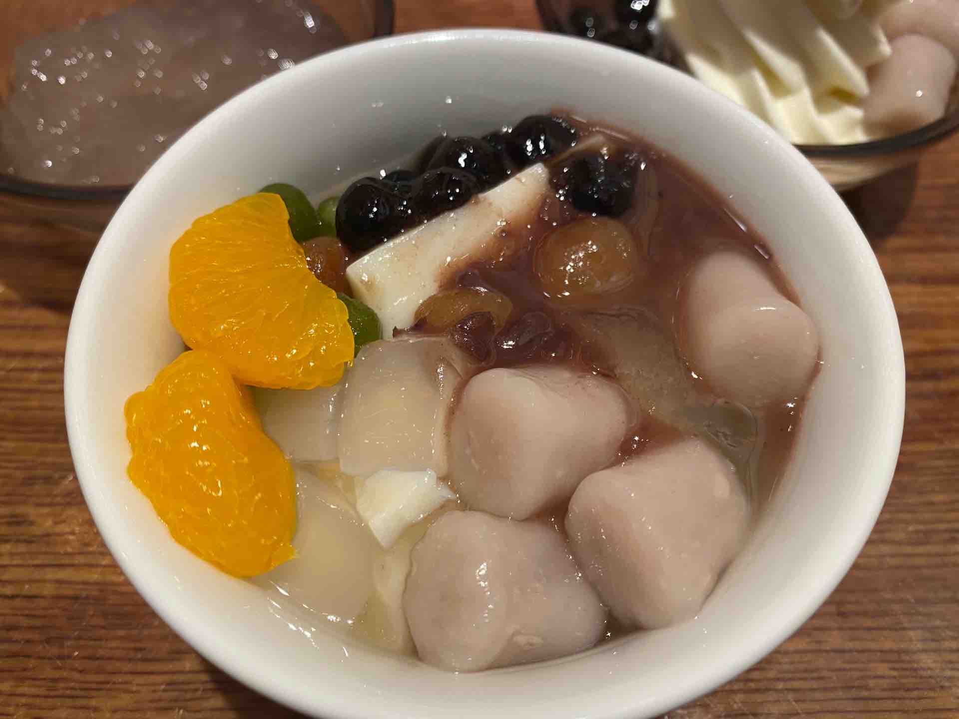 色々トッピング出来るのが楽しく台湾では甘く柔らかく煮込んだ花生(ピーナッツ)と一緒にいただくのがスタンダードですが、今回はタロイモをモチモチっとさせた芋圓やタピオカなどが置いてありました。ナタデココや甘い豆類、フルーツなども追加して、豪華豆花に仕上げてみました。