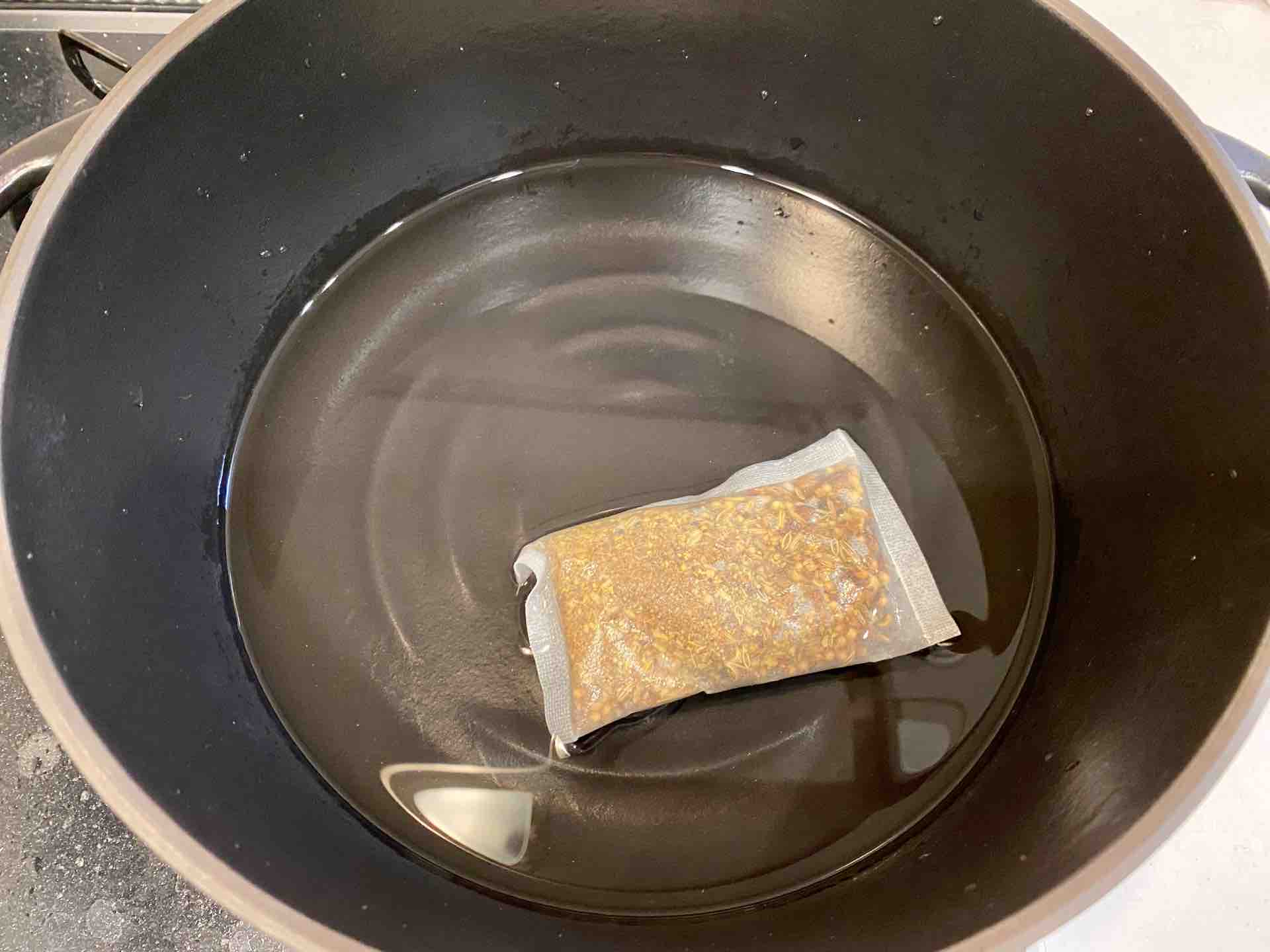 水一リットルを愛用のバーミキュラに入れ、パックを入れてみます。