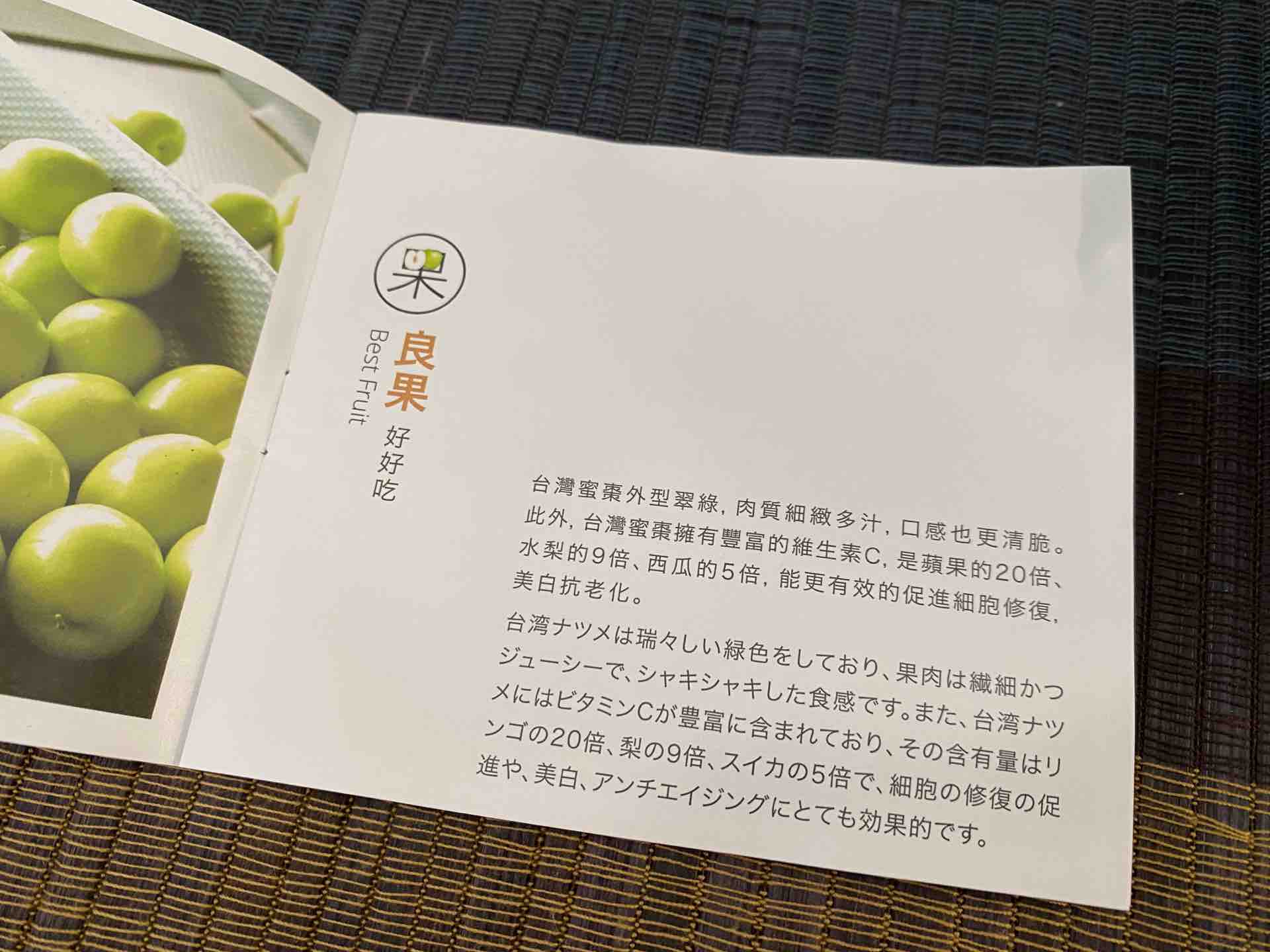 台湾ナツメはビタミンCが豊富に含まれており、含有量はリンゴの20倍だそうで、細胞の修復や促進、美白、アンチエイジングにも効果的だとか。