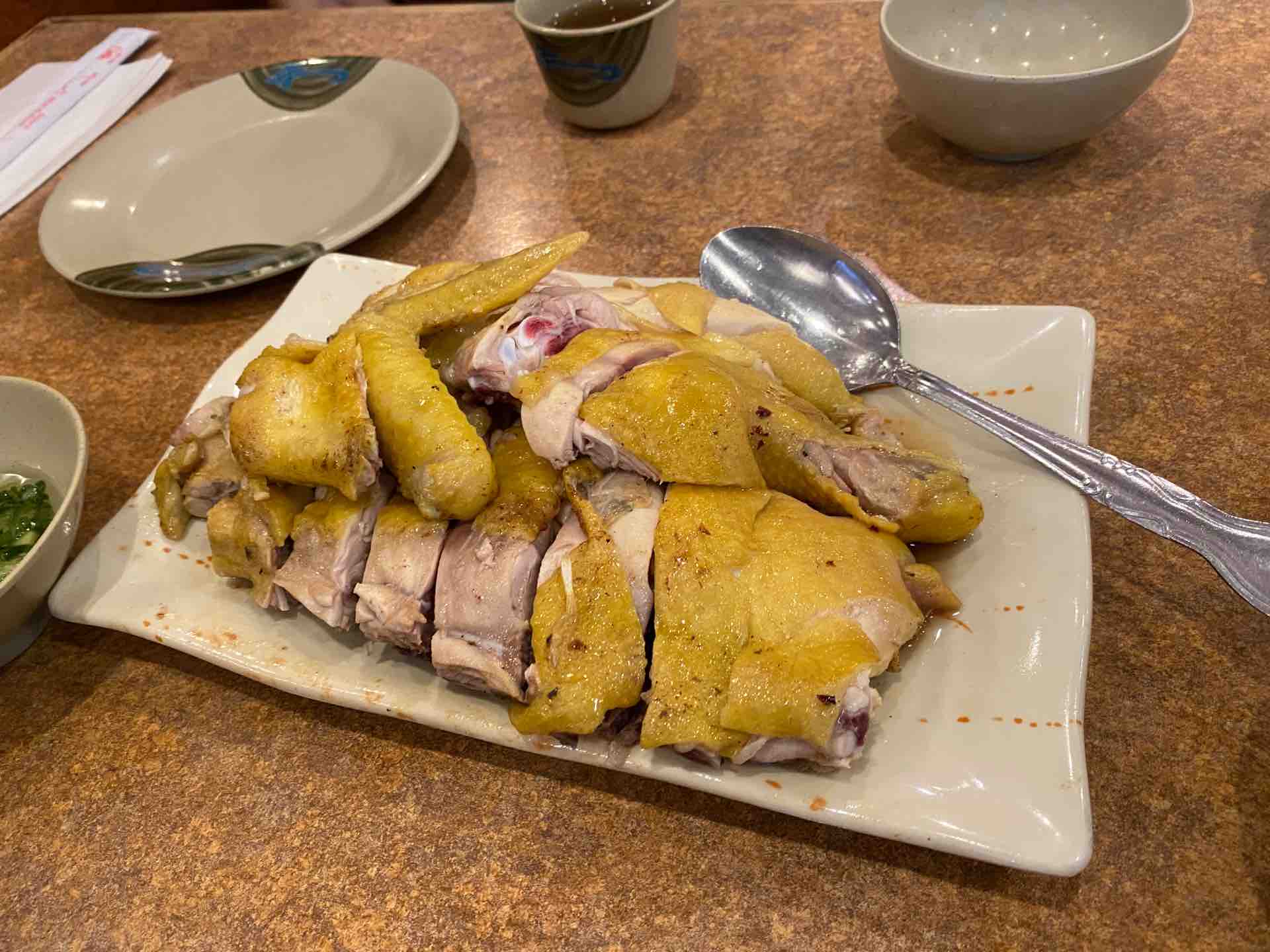 白切鶏的なやつで、ねぎ油ソースと一緒にいただきます。