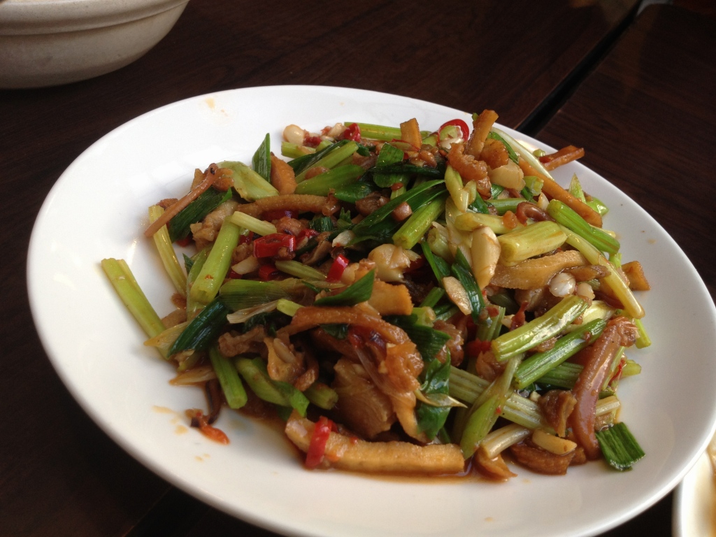 ネギや生姜と一緒に炒められ、味付けはお酒のアテにピッタリ!